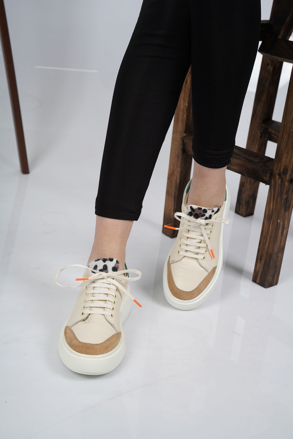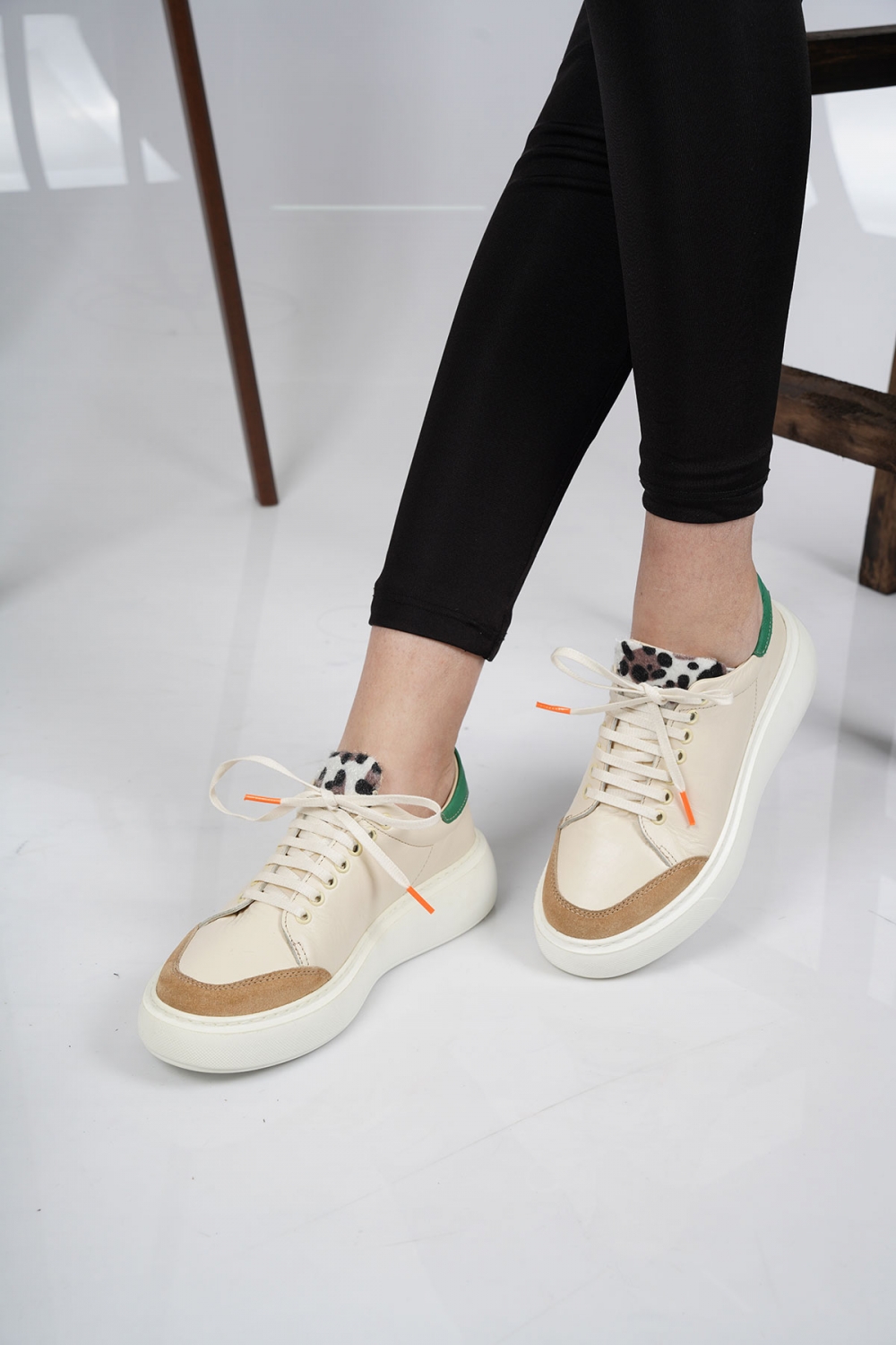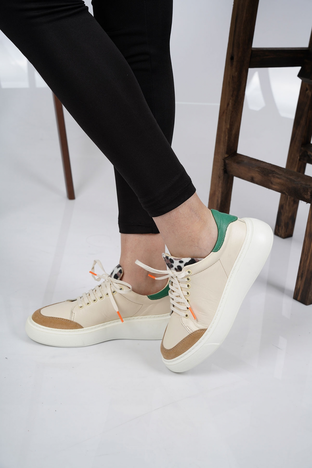 Hakiki Deri Açık Bej-Beyaz-Yeşil Kadın Sneaker Ayakkabı 221220104