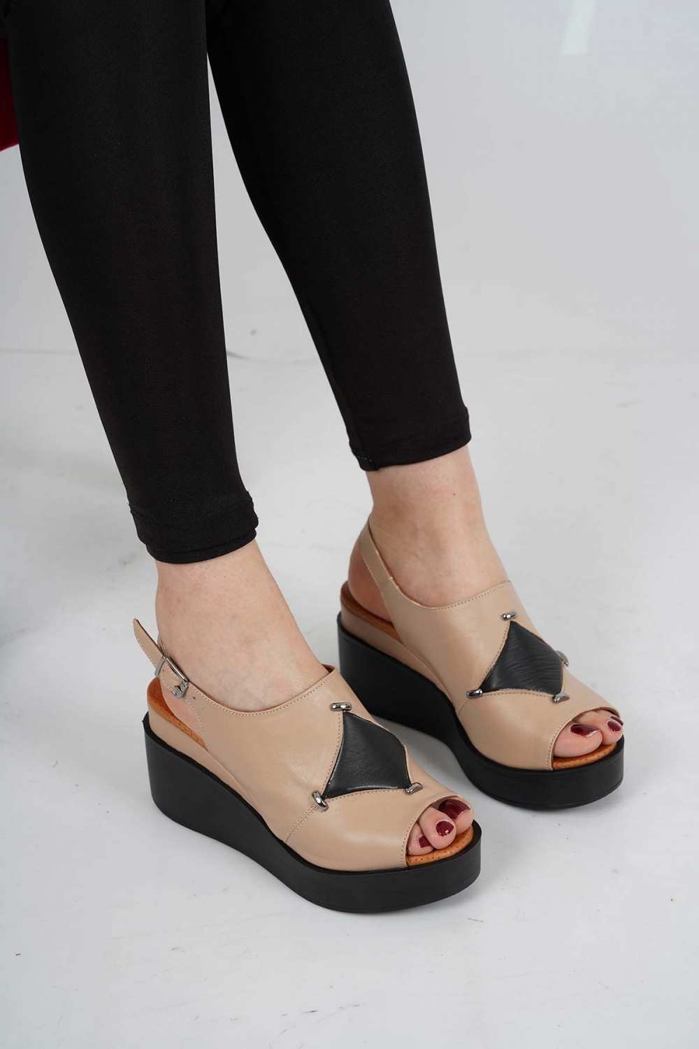 Hakiki Deri Badem-Siyah Kadın Dolgu Topuk Sandalet 231229509