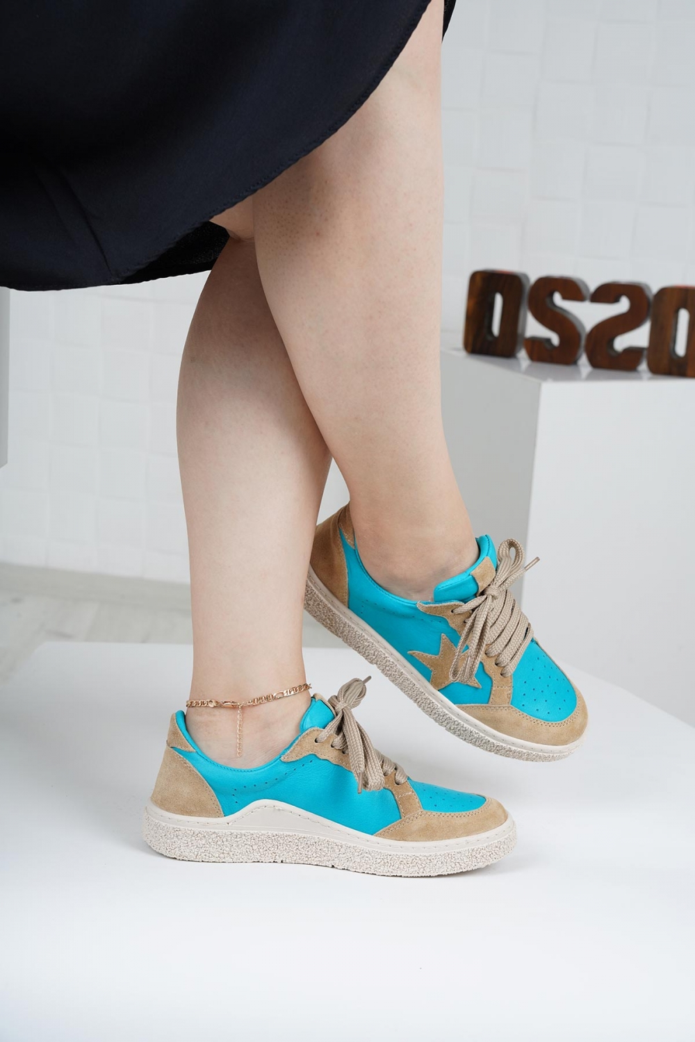 Hakiki Deri Bebe Mavi-Bej Süet Kadın Spor Ayakkabı 222220101