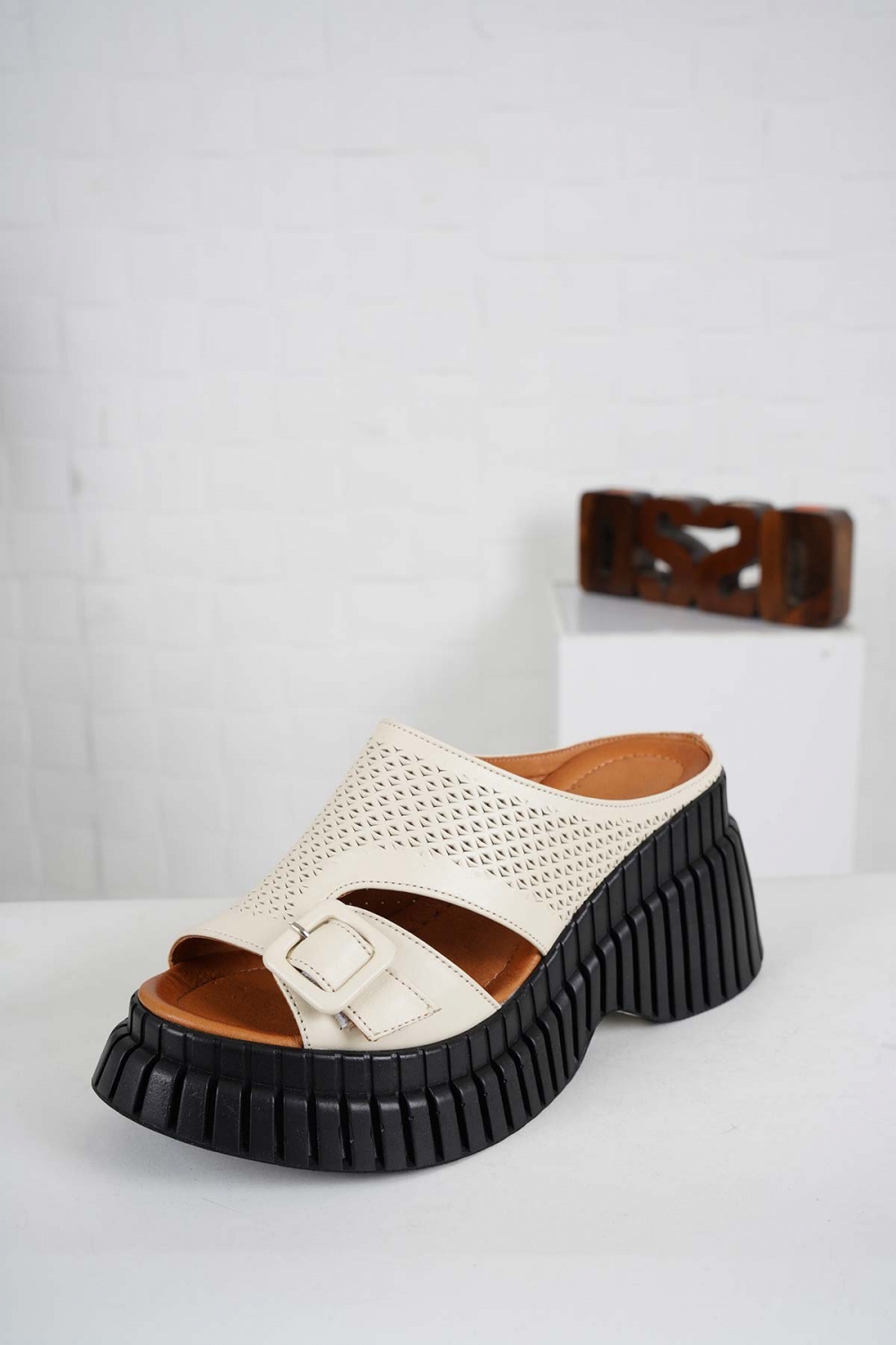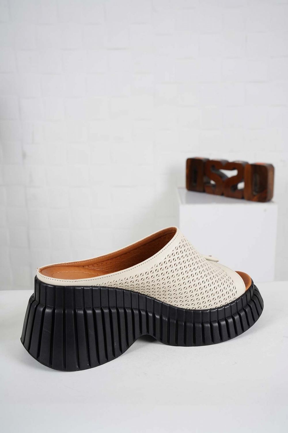 Hakiki Deri Bej Kadın Dolgu Topuk Terlik 241229608