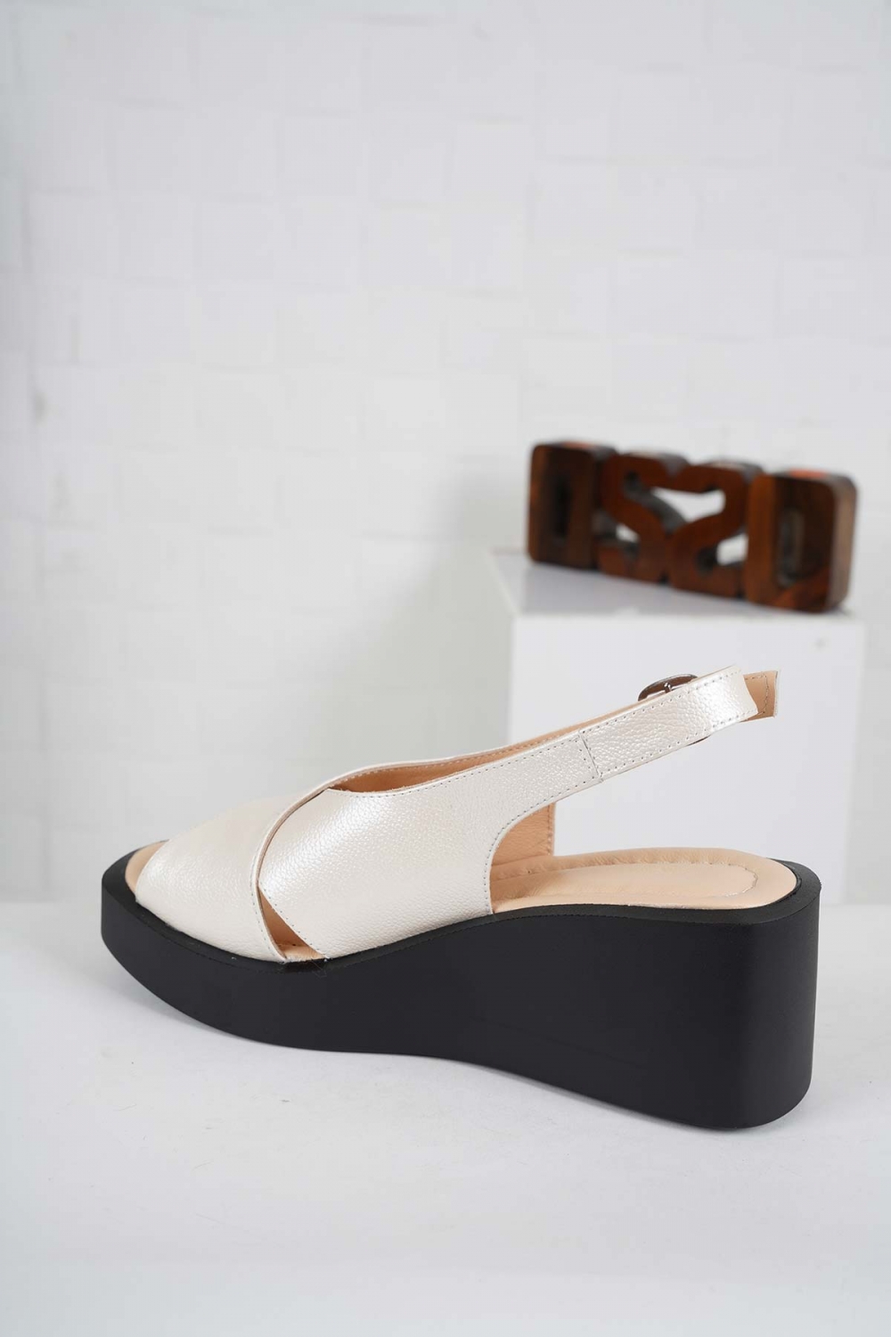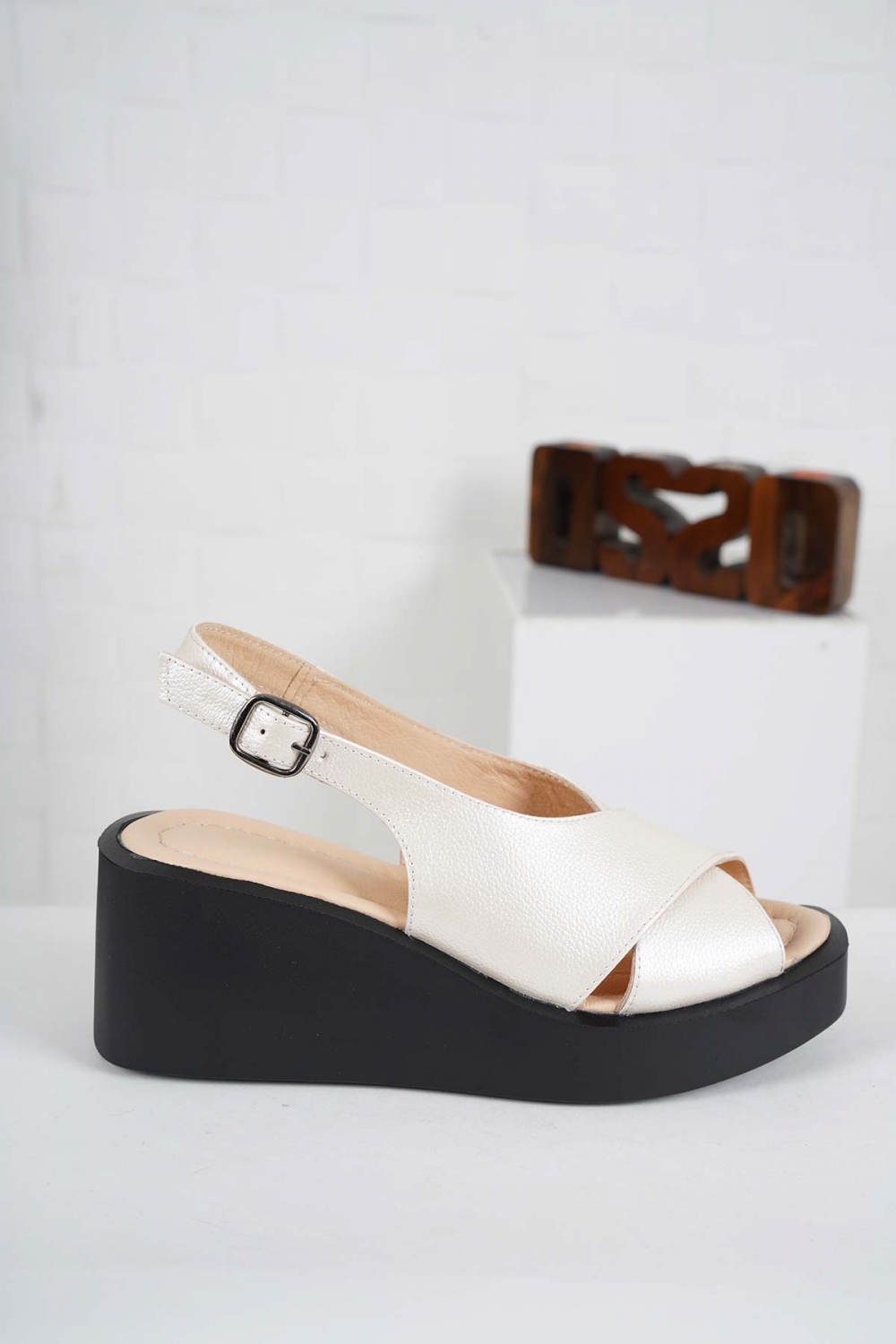 Hakiki Deri Bej Sedef Kadın Dolgu Topuk Sandalet 241189501