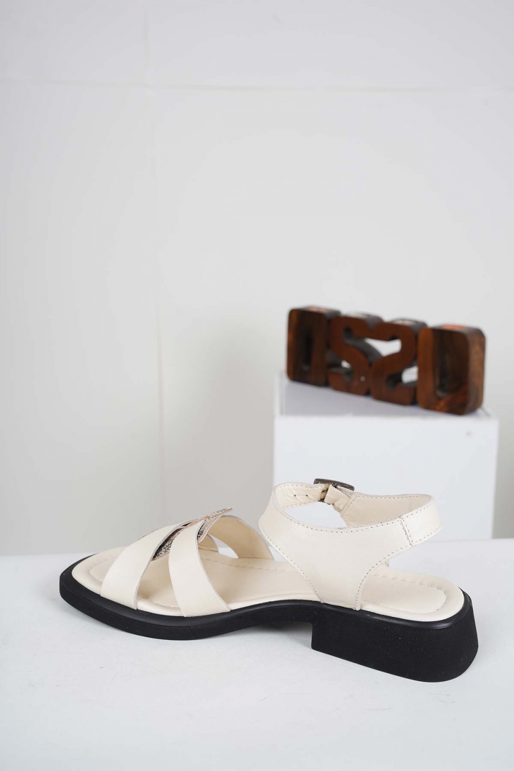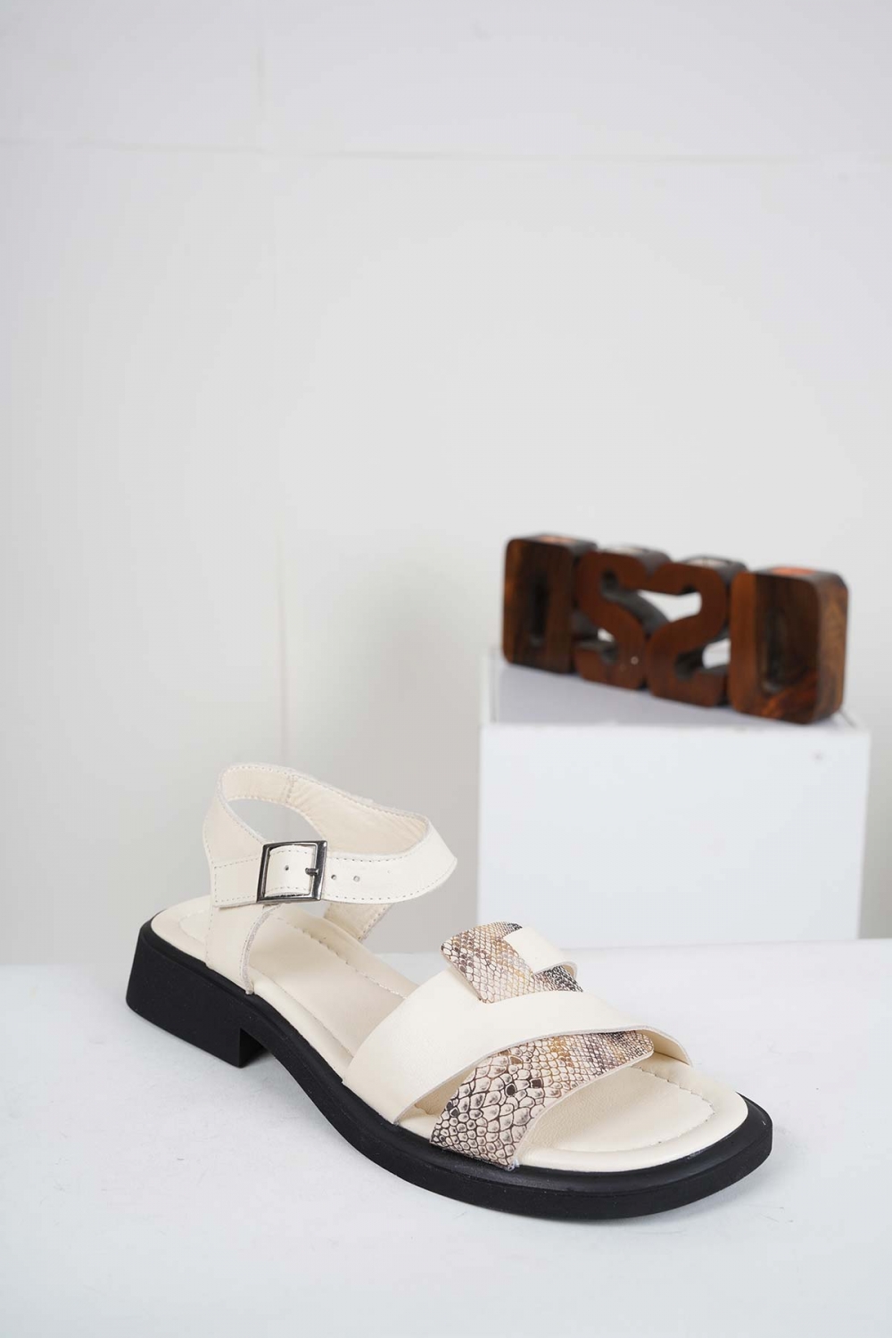 Hakiki Deri Bej-Yılan Baskı Kadın Alçak Topuklu Sandalet 241225503