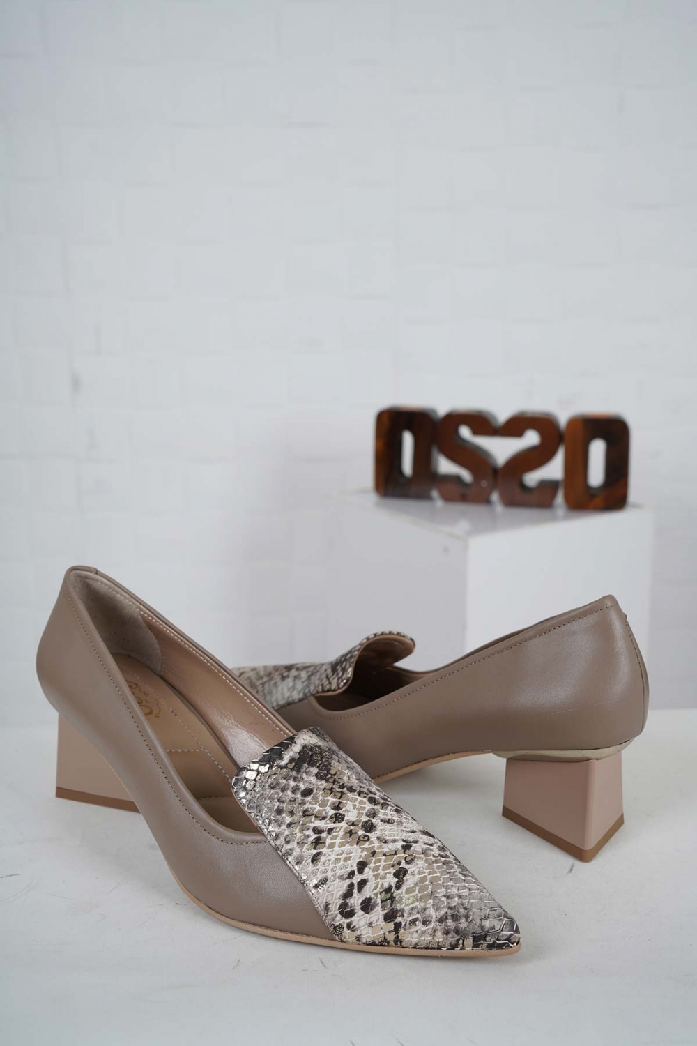 Hakiki Deri Bej Yılan-Vizon Kadın Topuklu Ayakkabı 242127113