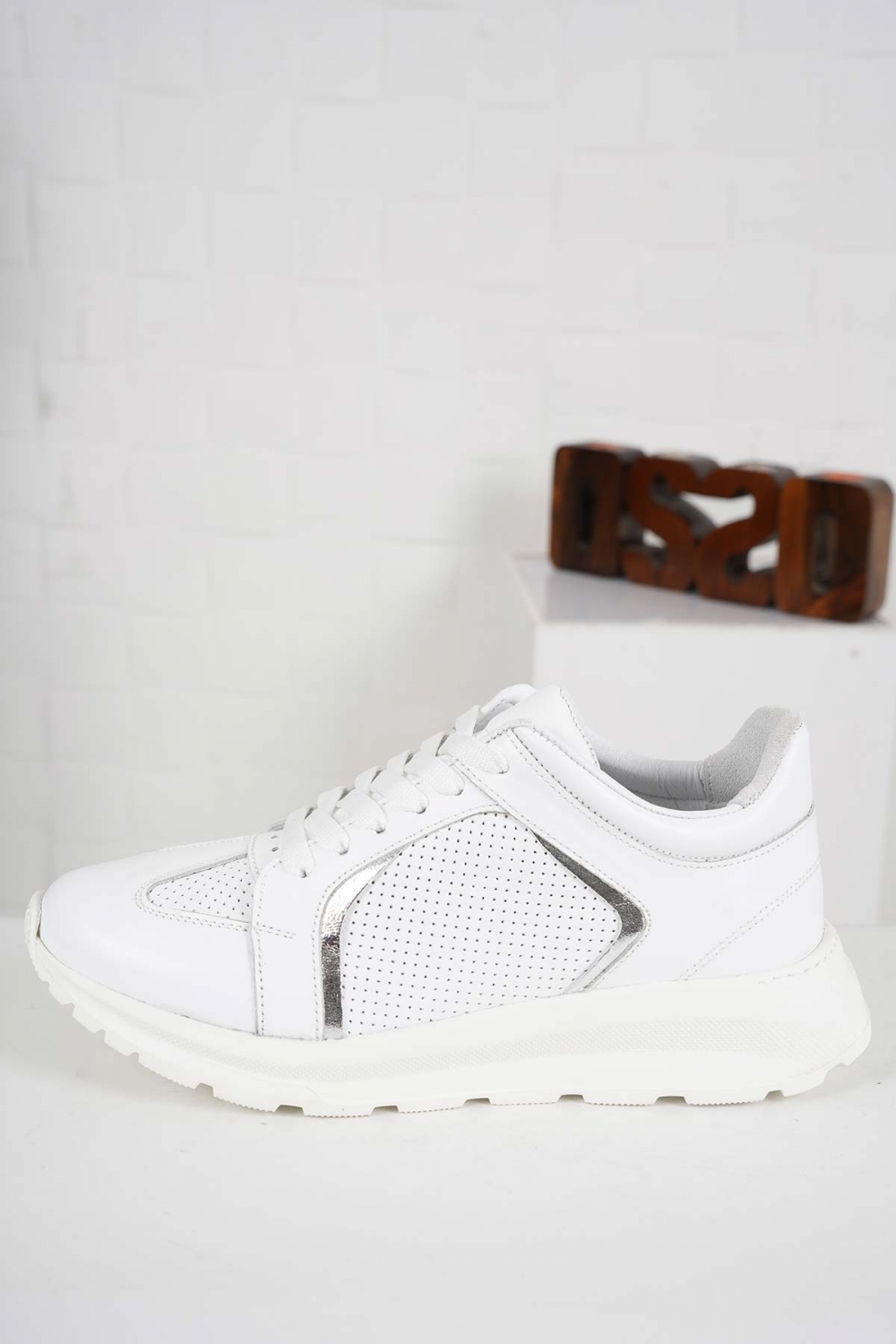 Hakiki Deri Beyaz-Gümüş Kadın Sneaker Ayakkabı 241218106