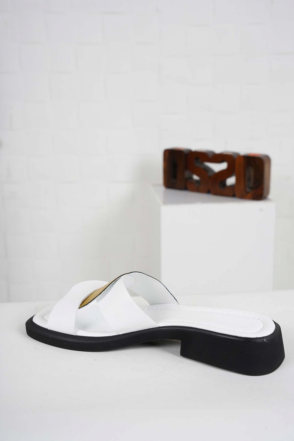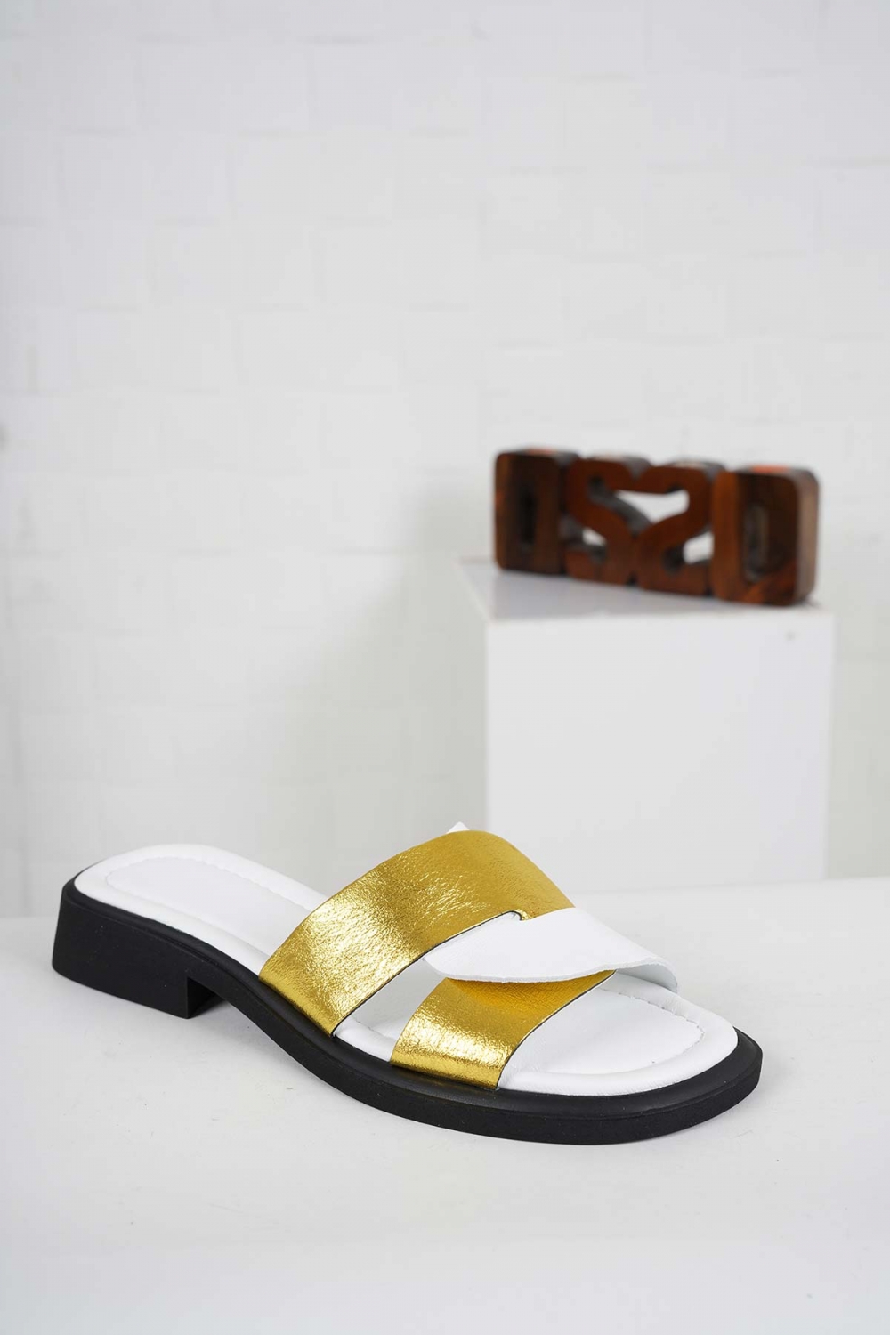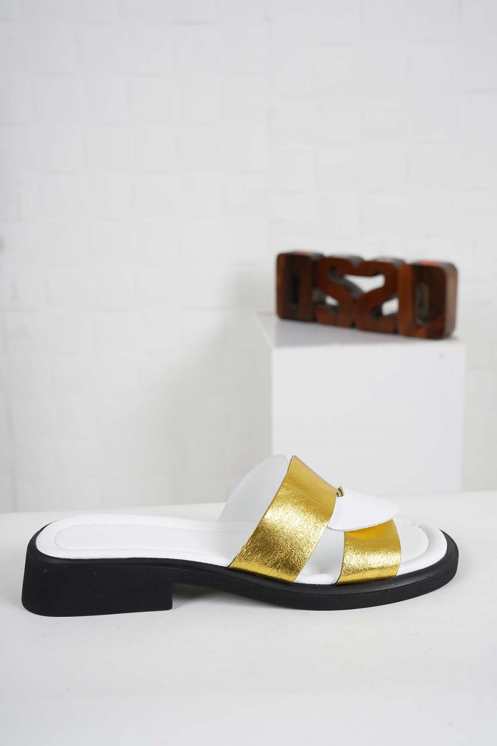 Hakiki Deri Beyaz-Metalik Sarı Kadın Alçak Topuklu Terlik 241225603