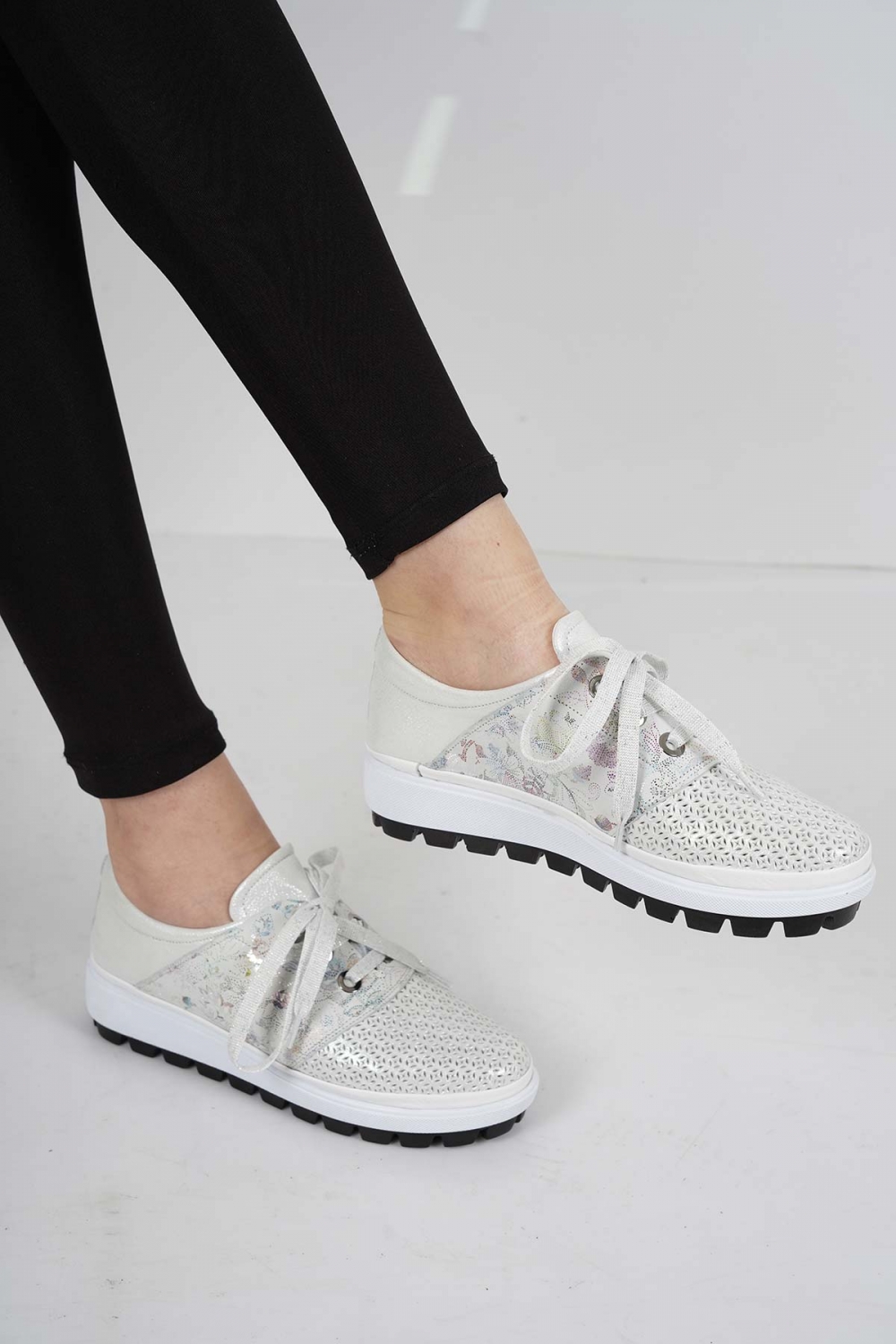 Hakiki Deri Beyaz Saten-Beyaz Baskılı Kadın Spor Ayakkabı 221186111