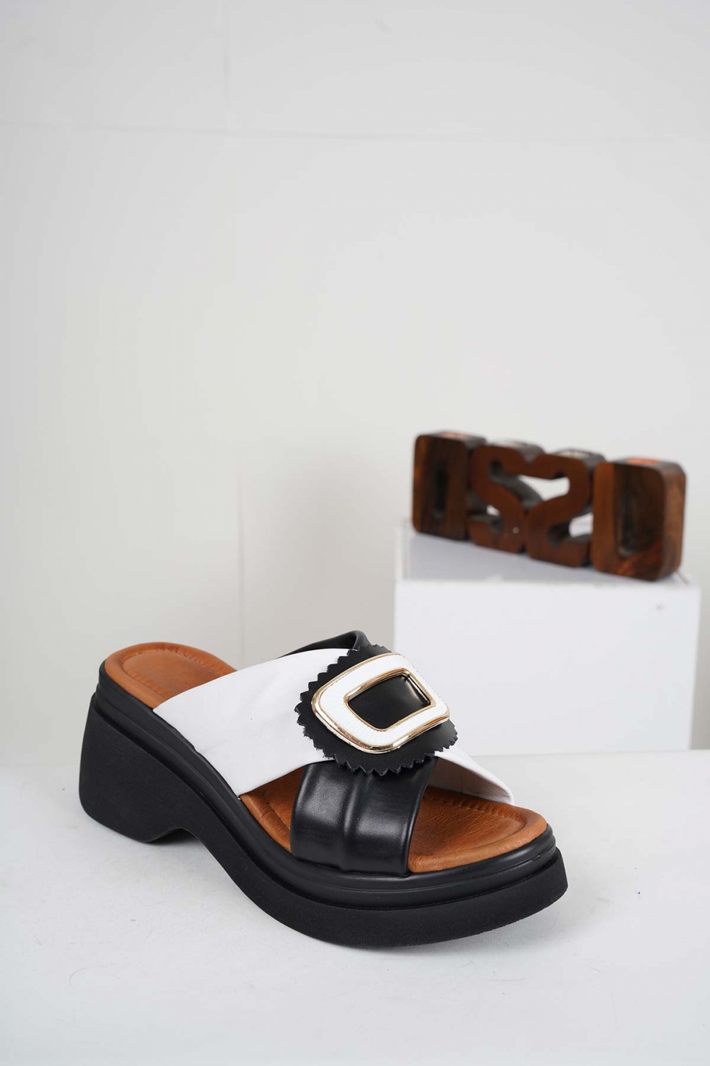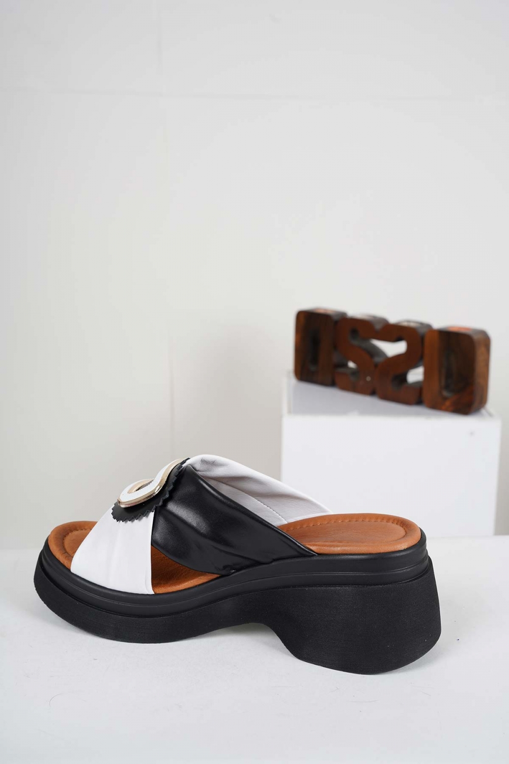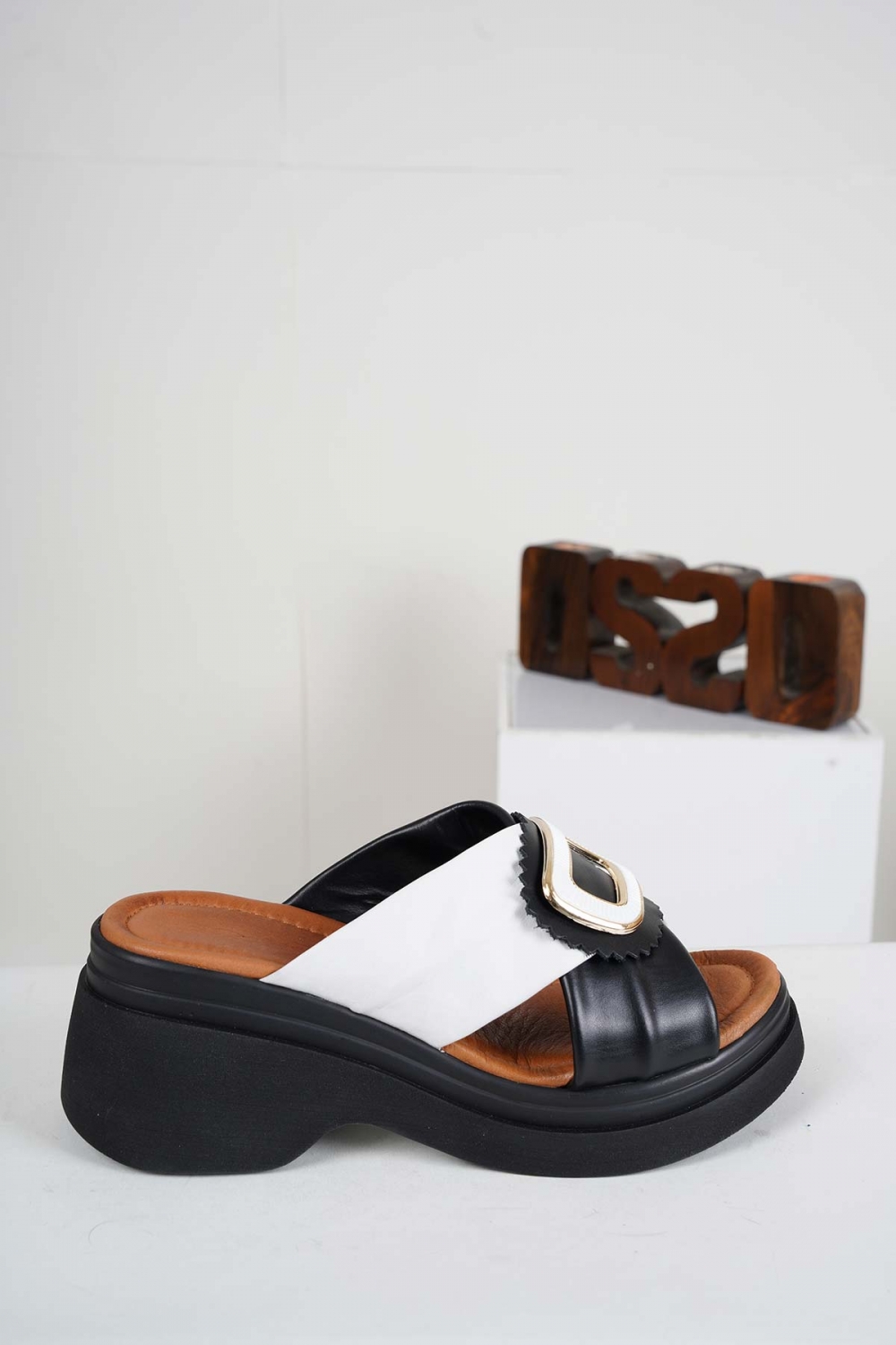 Hakiki Deri Beyaz-Siyah Kadın Dolgu Topuklu Terlik 241186604