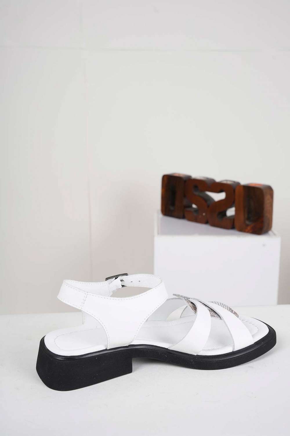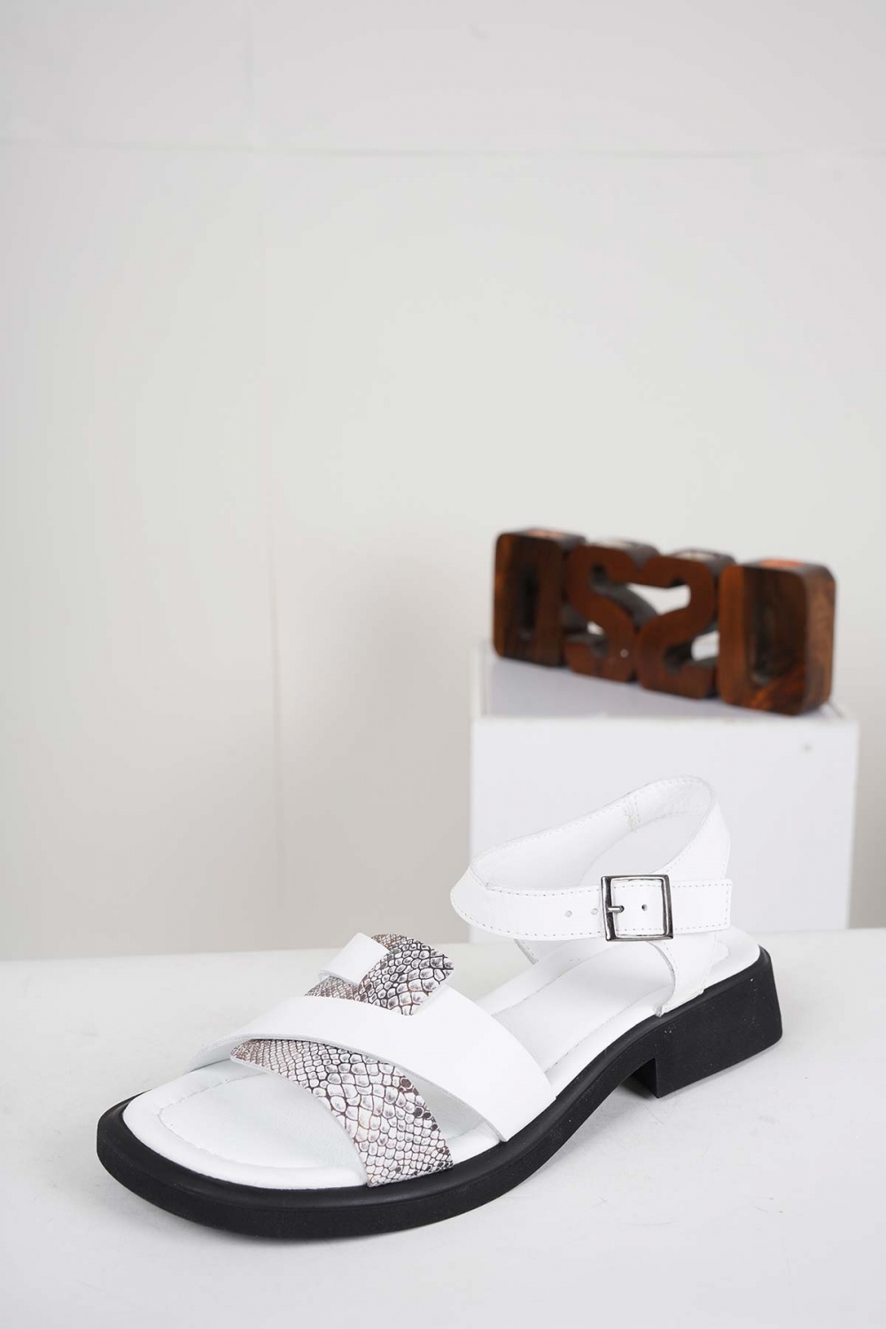 Hakiki Deri Beyaz-Yılan Baskı Kadın Alçak Topuklu Sandalet 241225503