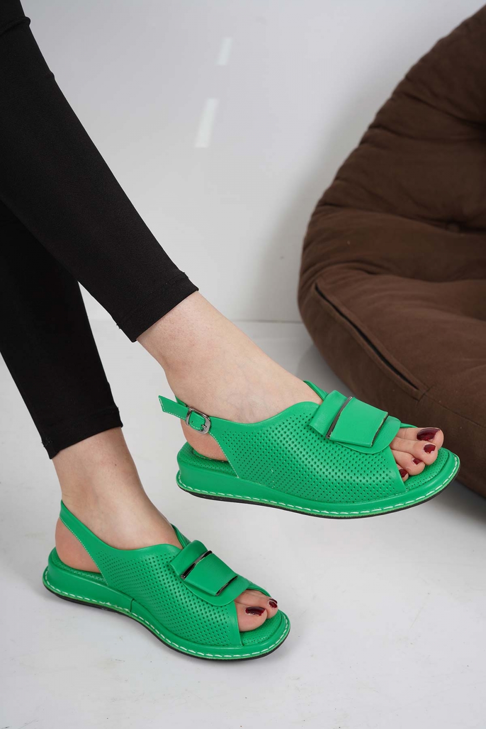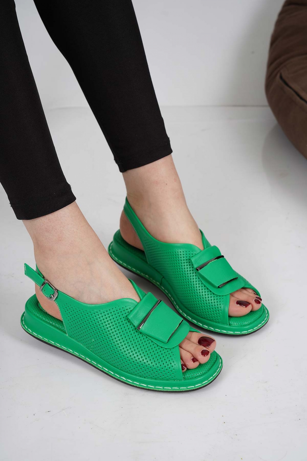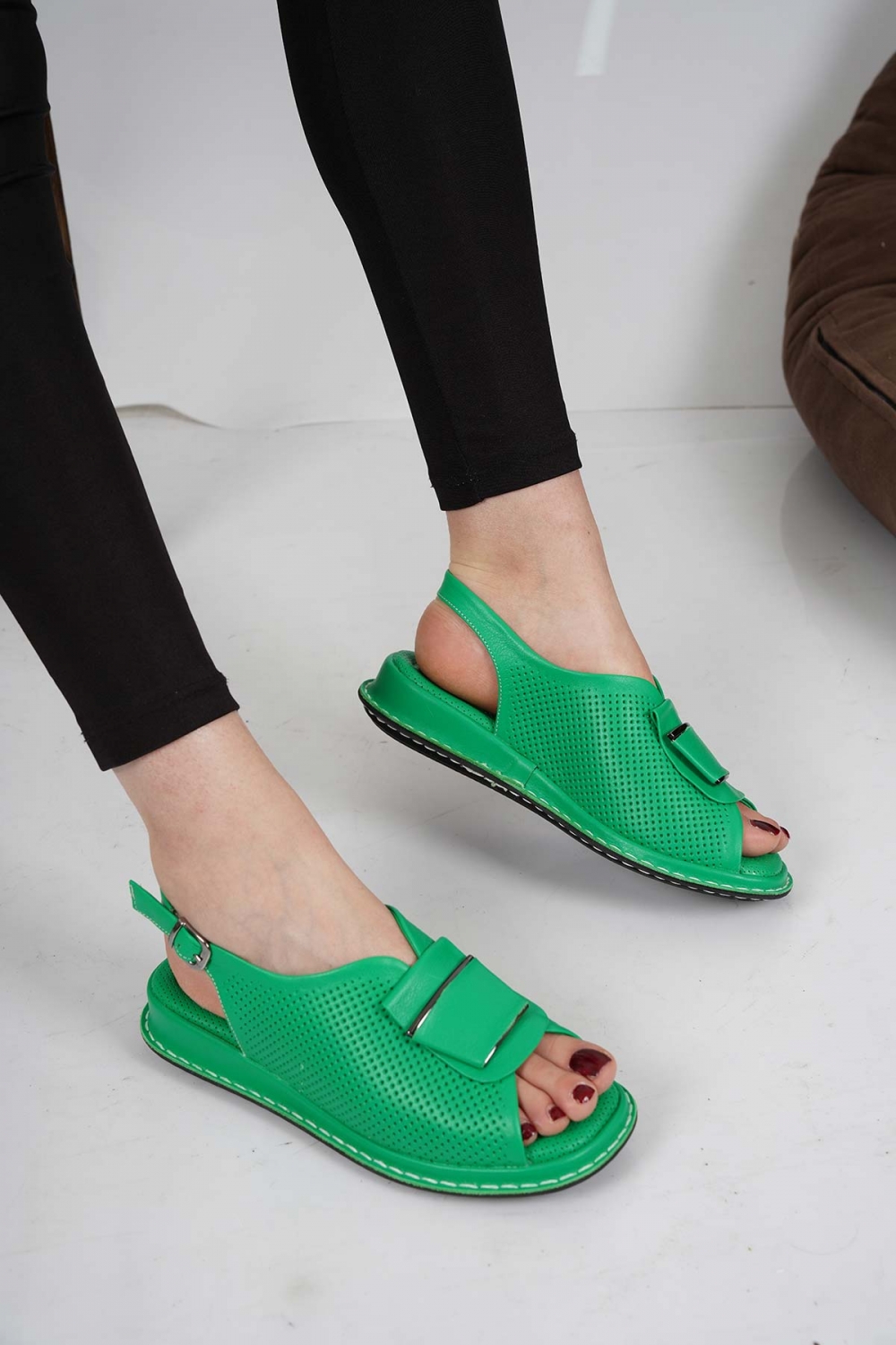 Hakiki Deri Çimen Yeşili Kadın Düz Sandalet 231100501