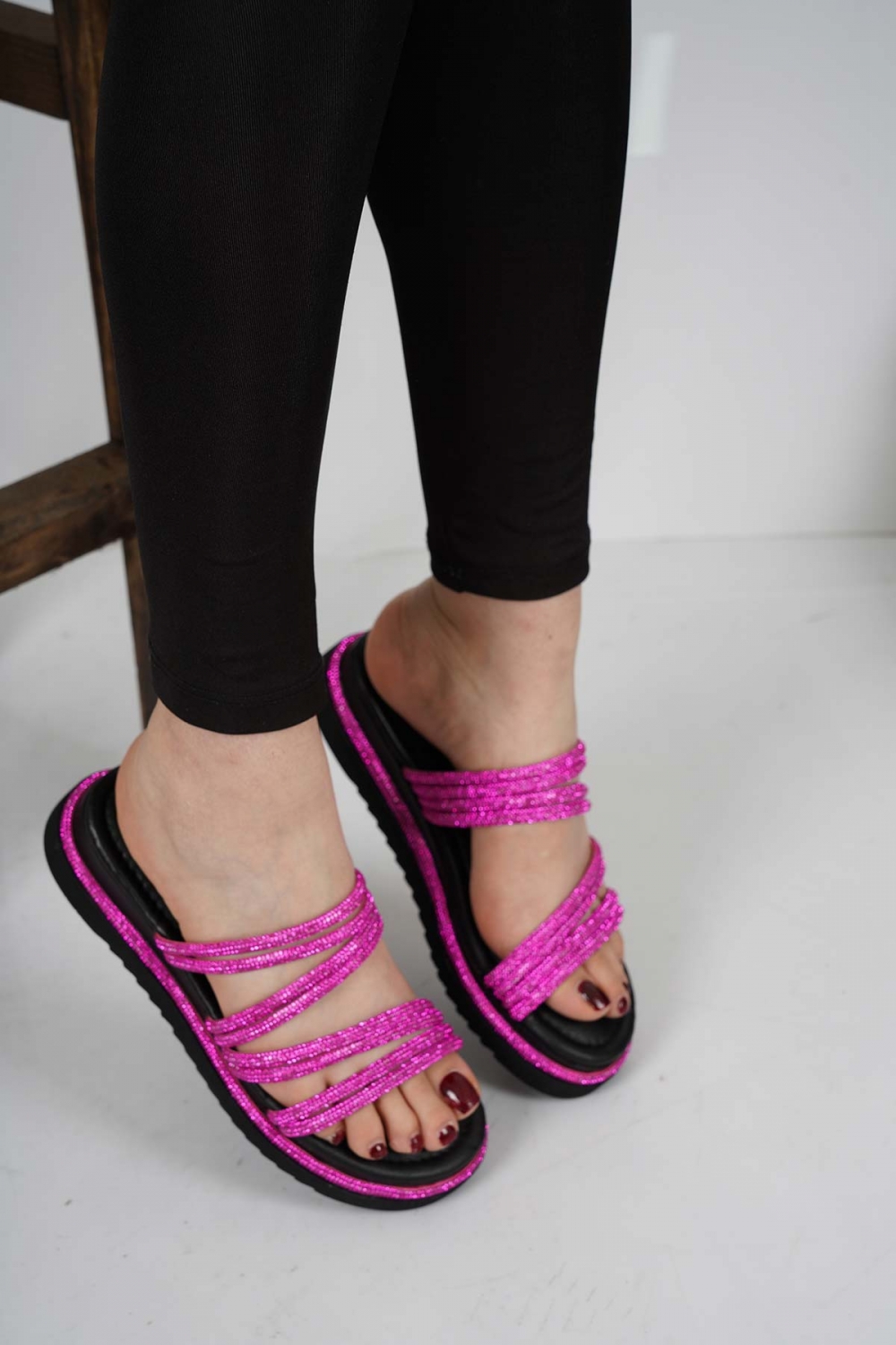 Hakiki Deri Fuşya Taş Kadın Taşlı Terlik 231114608