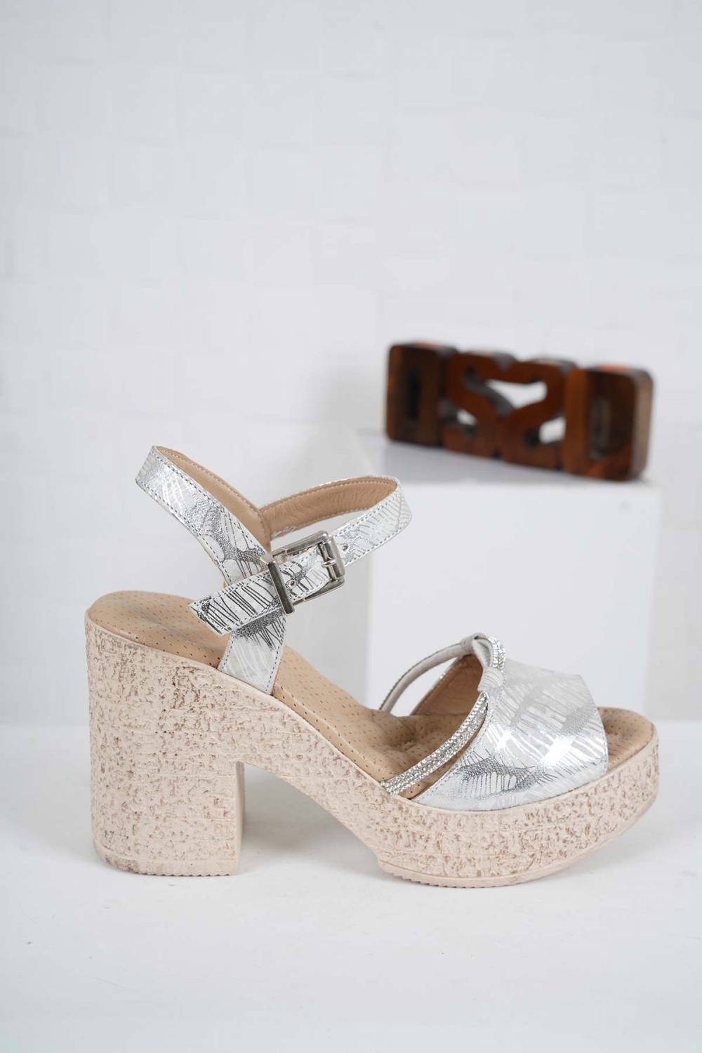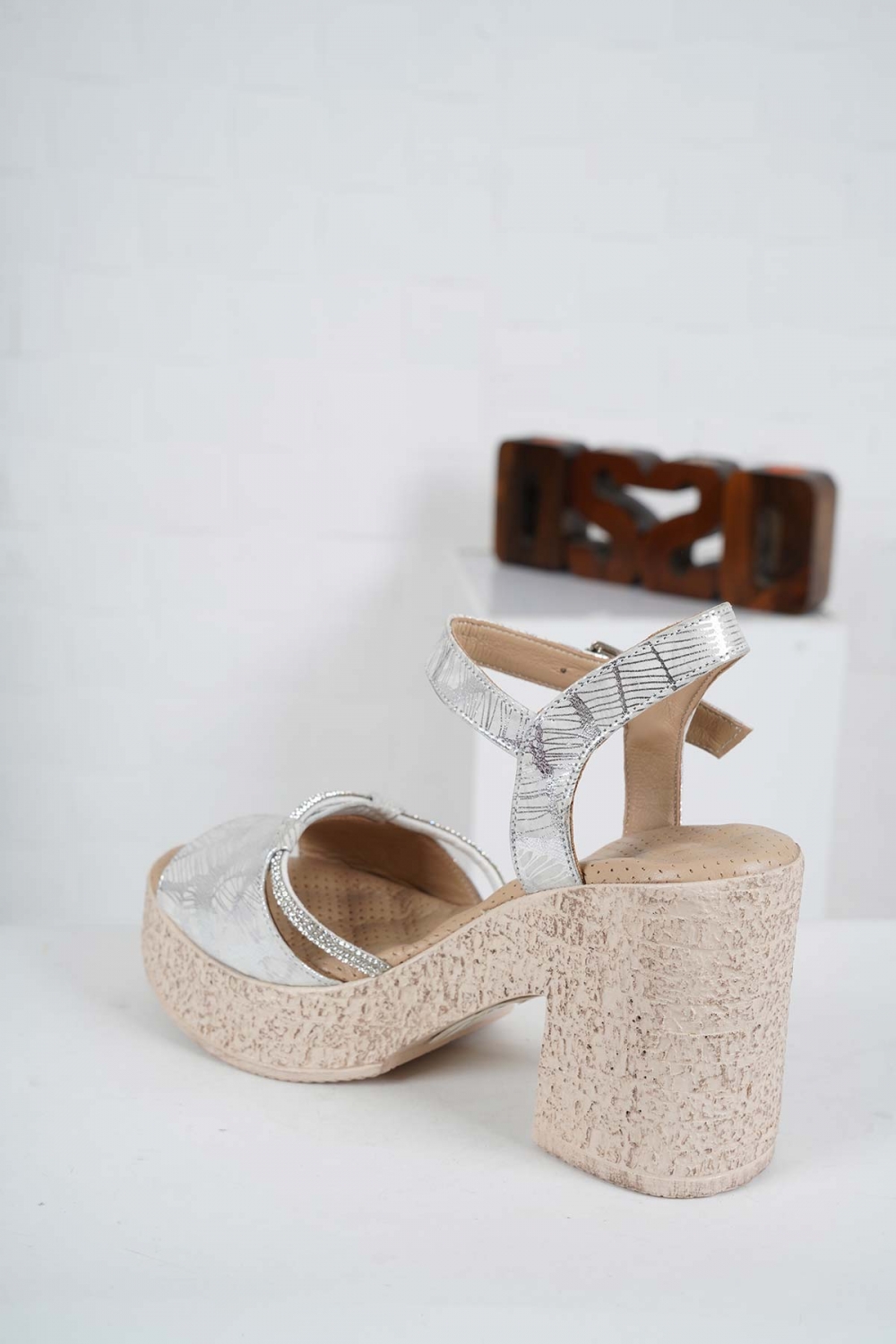 Hakiki Deri Gümüş Baskılı Kadın Yüksek Topuklu Sandalet 241136504