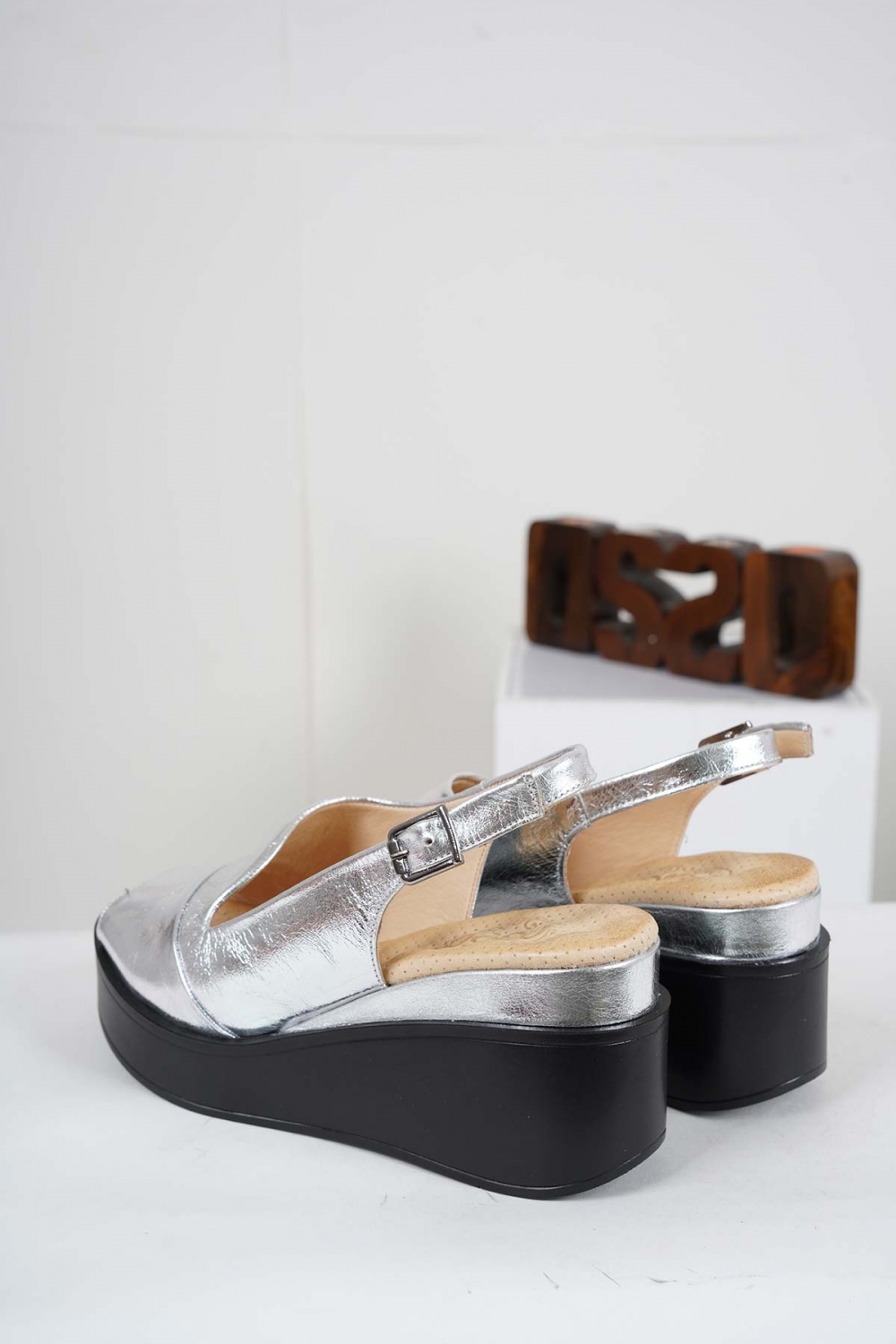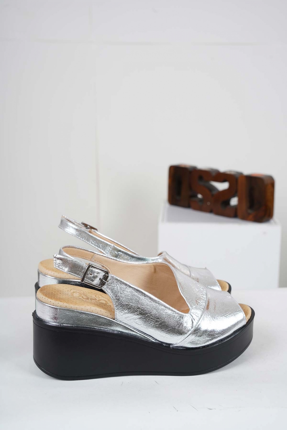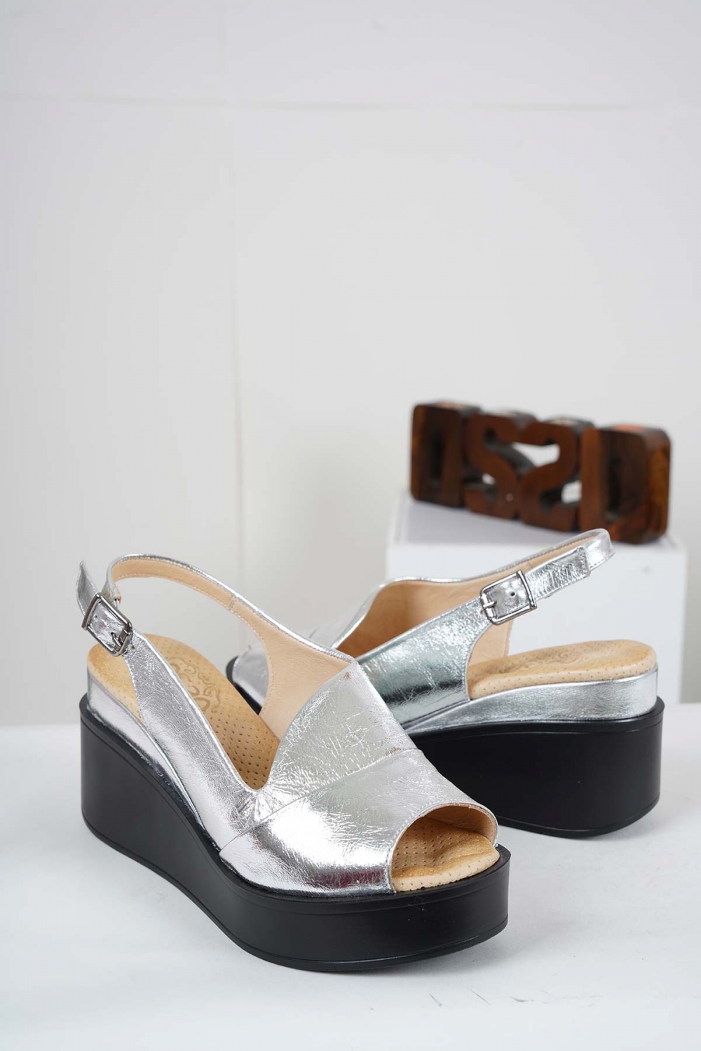 Hakiki Deri Gümüş Kadın Dolgu Topuk Sandalet 221229502