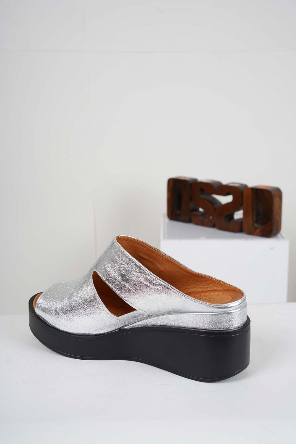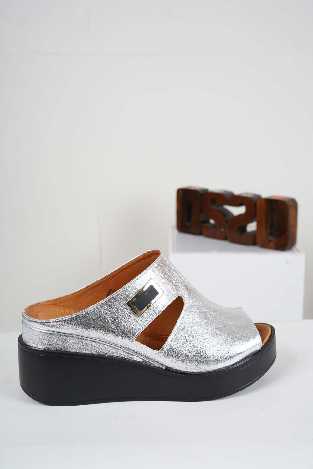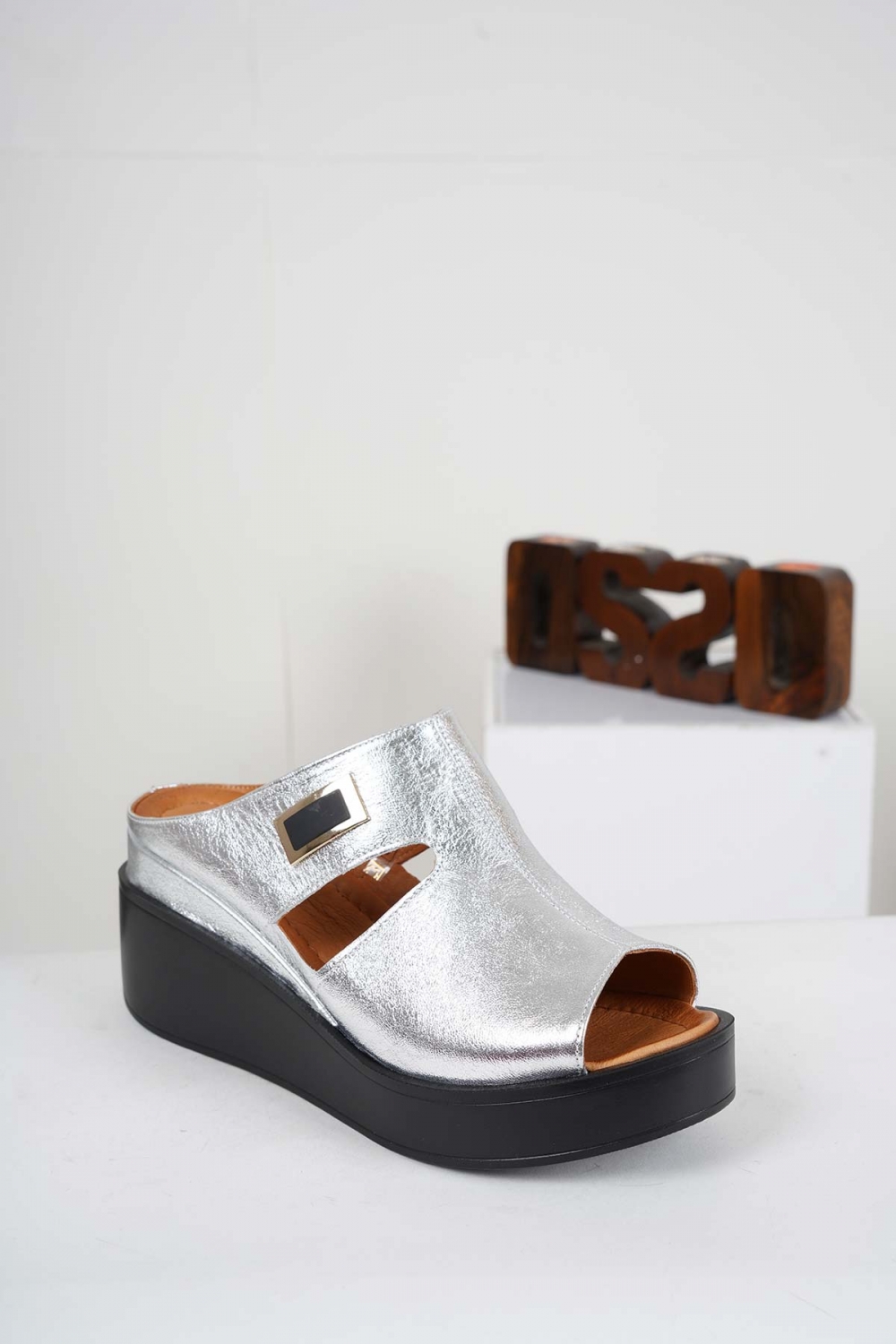 Hakiki Deri Gümüş Kadın Dolgu Topuklu Terlik 241229613