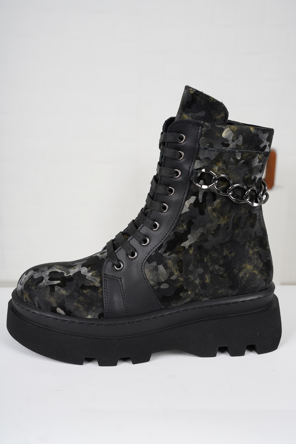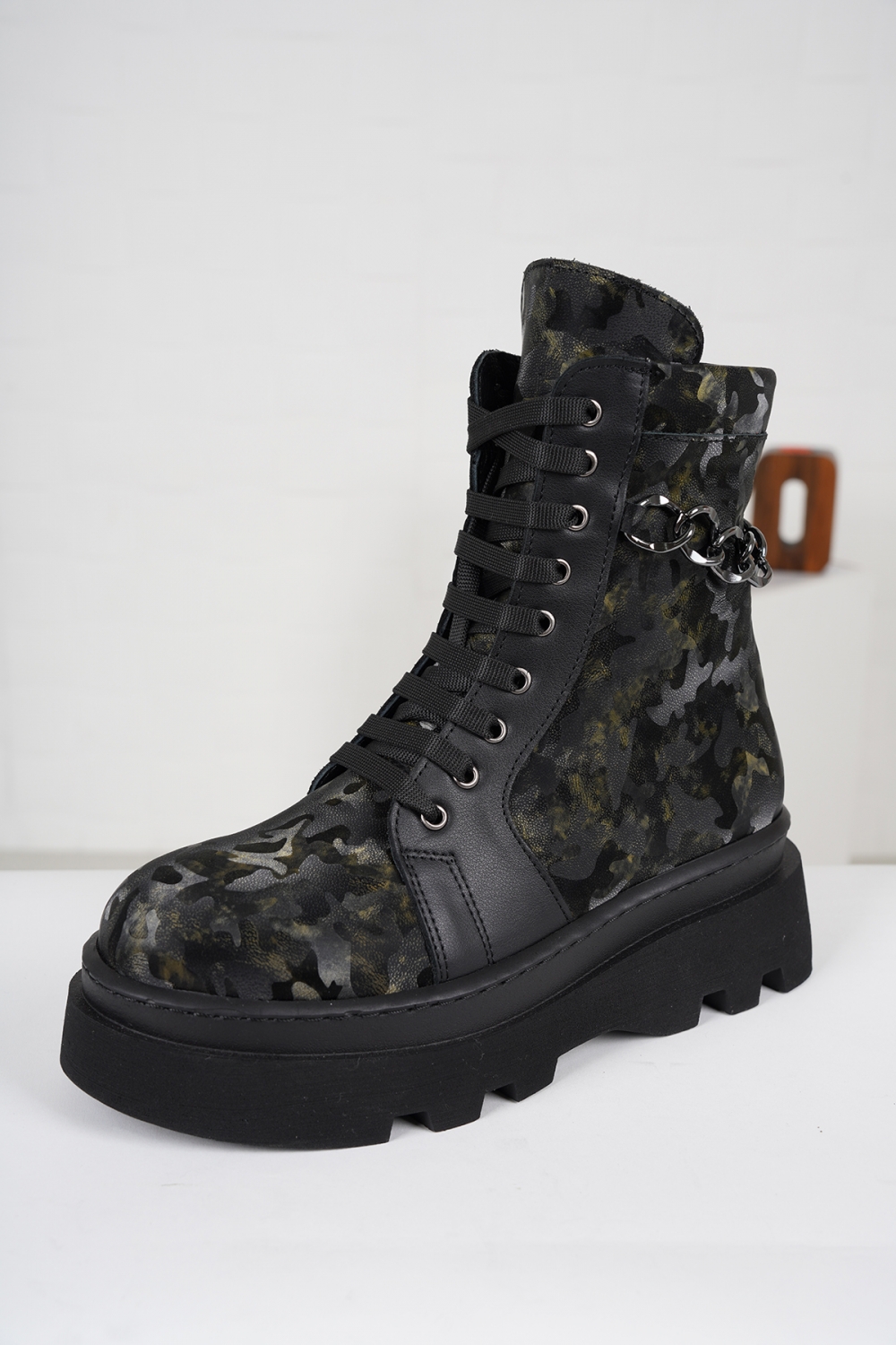 Hakiki Deri Haki Kamuflaj-Siyah Kadın Kısa Bot 222186203
