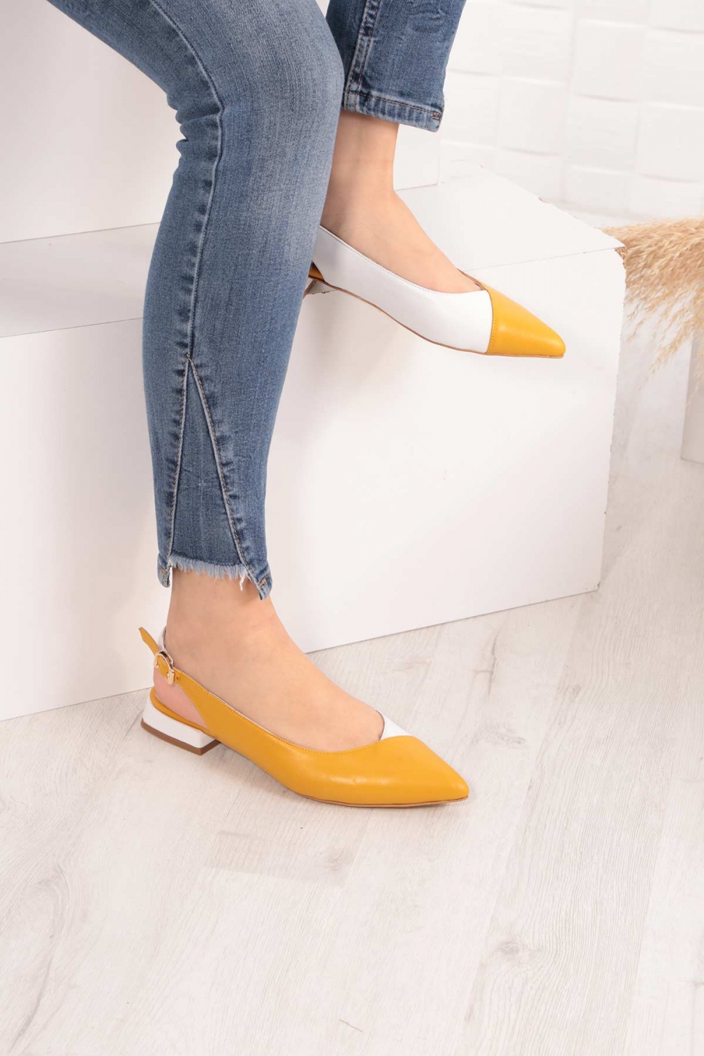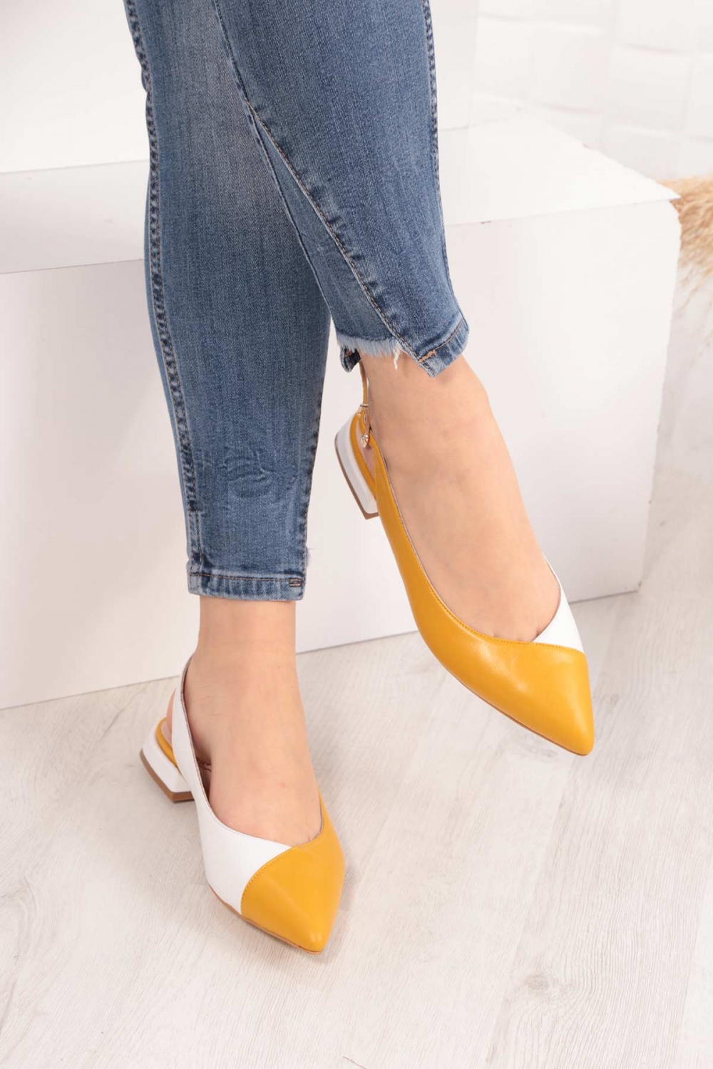 Hakiki Deri Hardal-Beyaz Kadın Burun Kapalı Sandalet 211127508