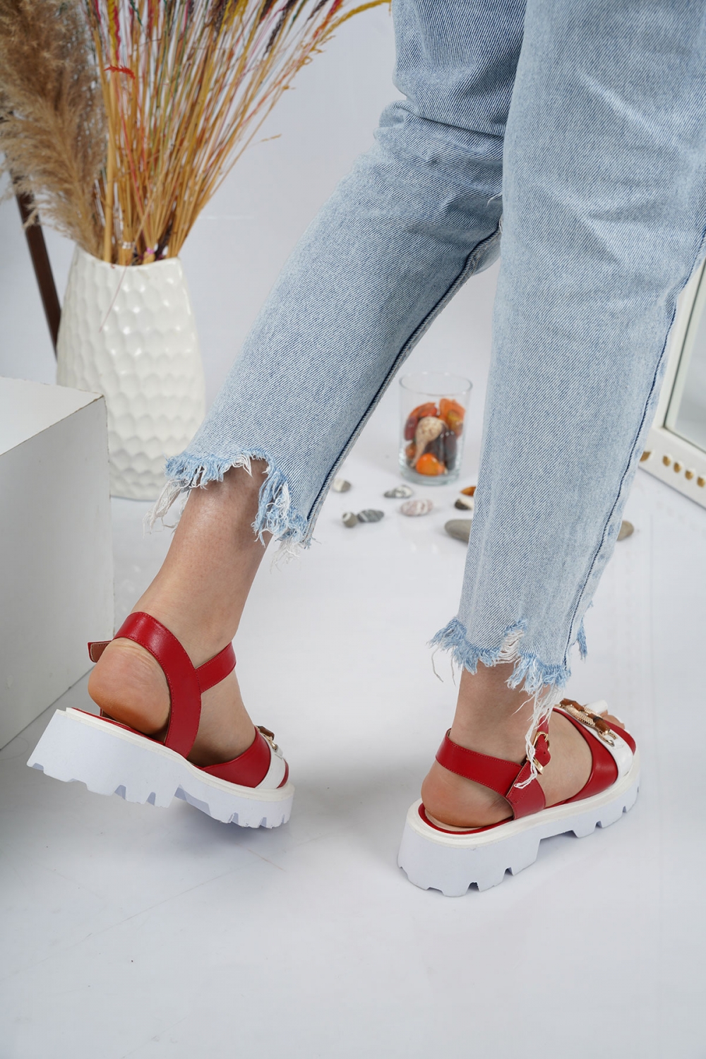 Hakiki Deri Kırmızı-Beyaz Kadın Casual Terlik 231127502