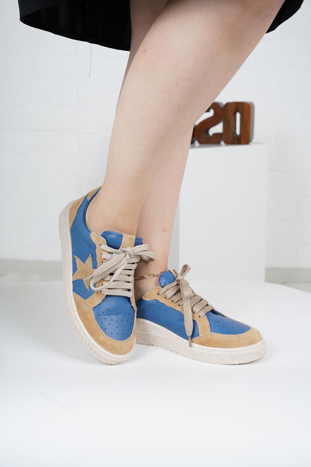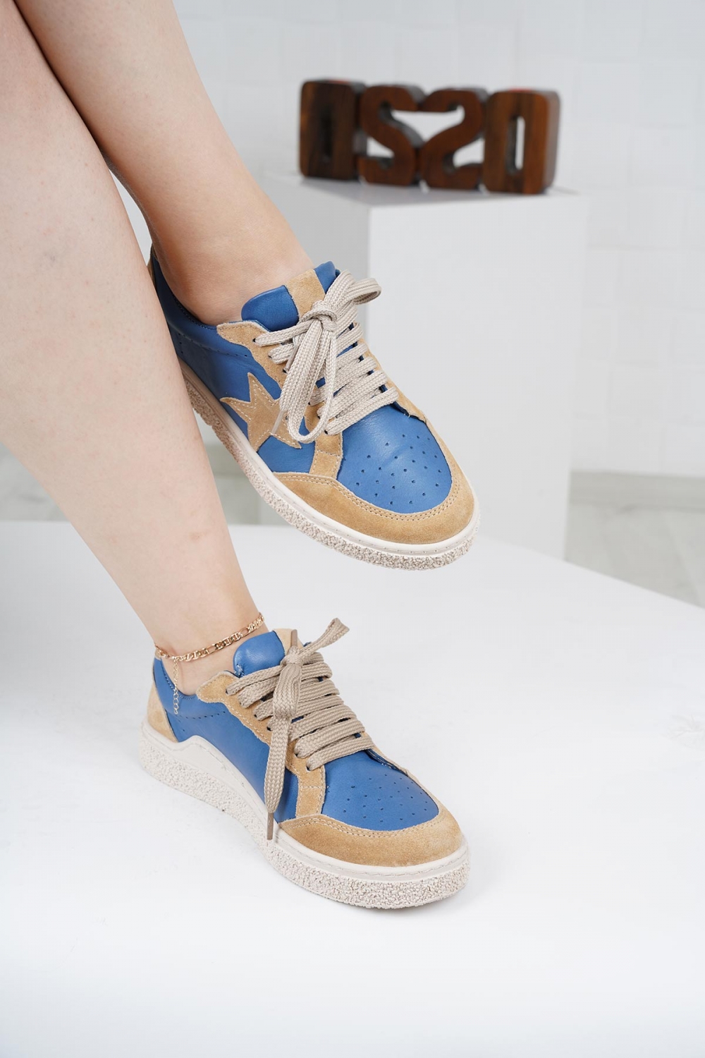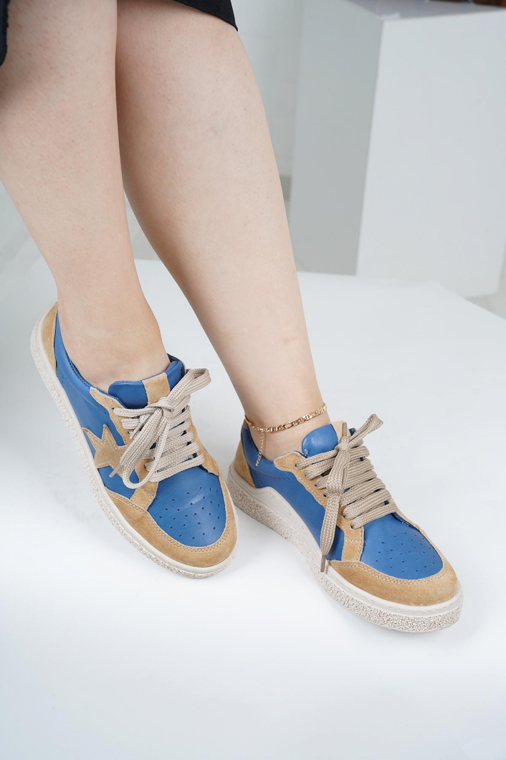 Hakiki Deri Kot Mavi-Bej Süet Kadın Spor Ayakkabı 222220101