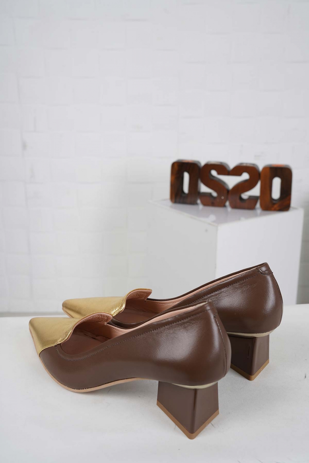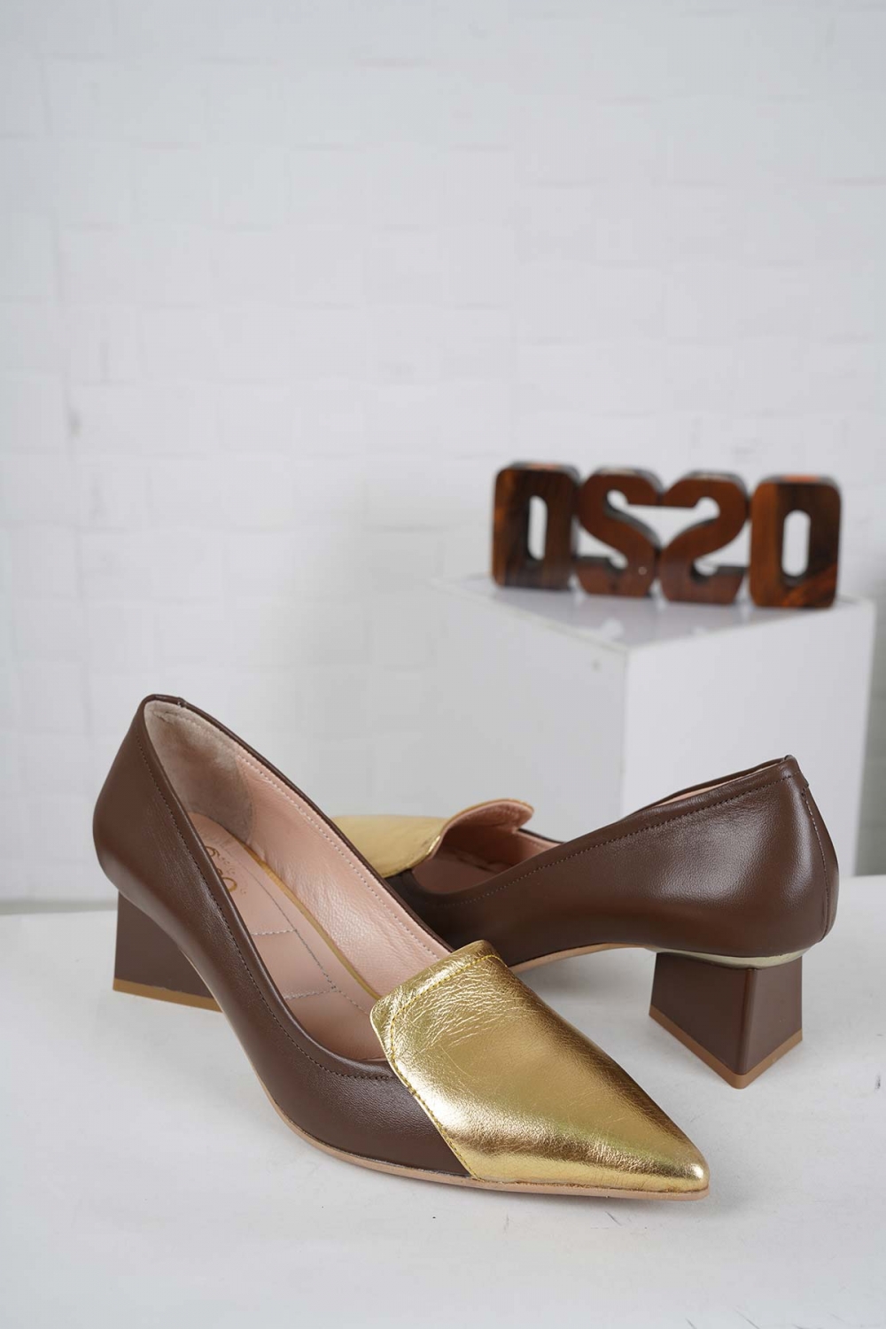 Hakiki Deri Koyu Altın-Kahve Kadın Topuklu Ayakkabı 242127113