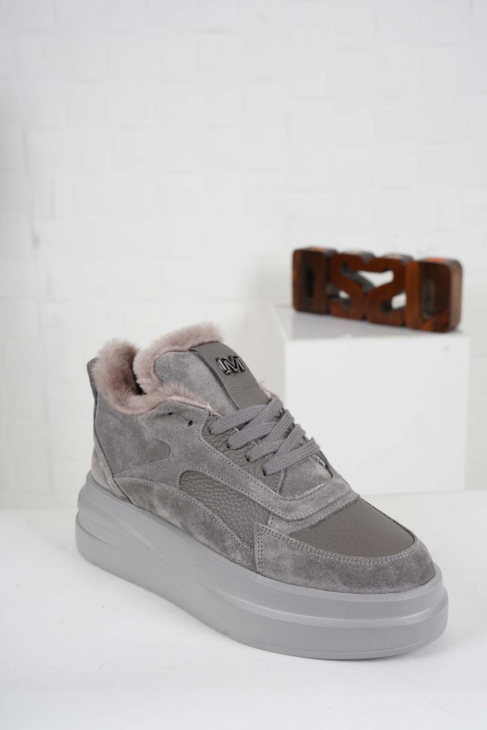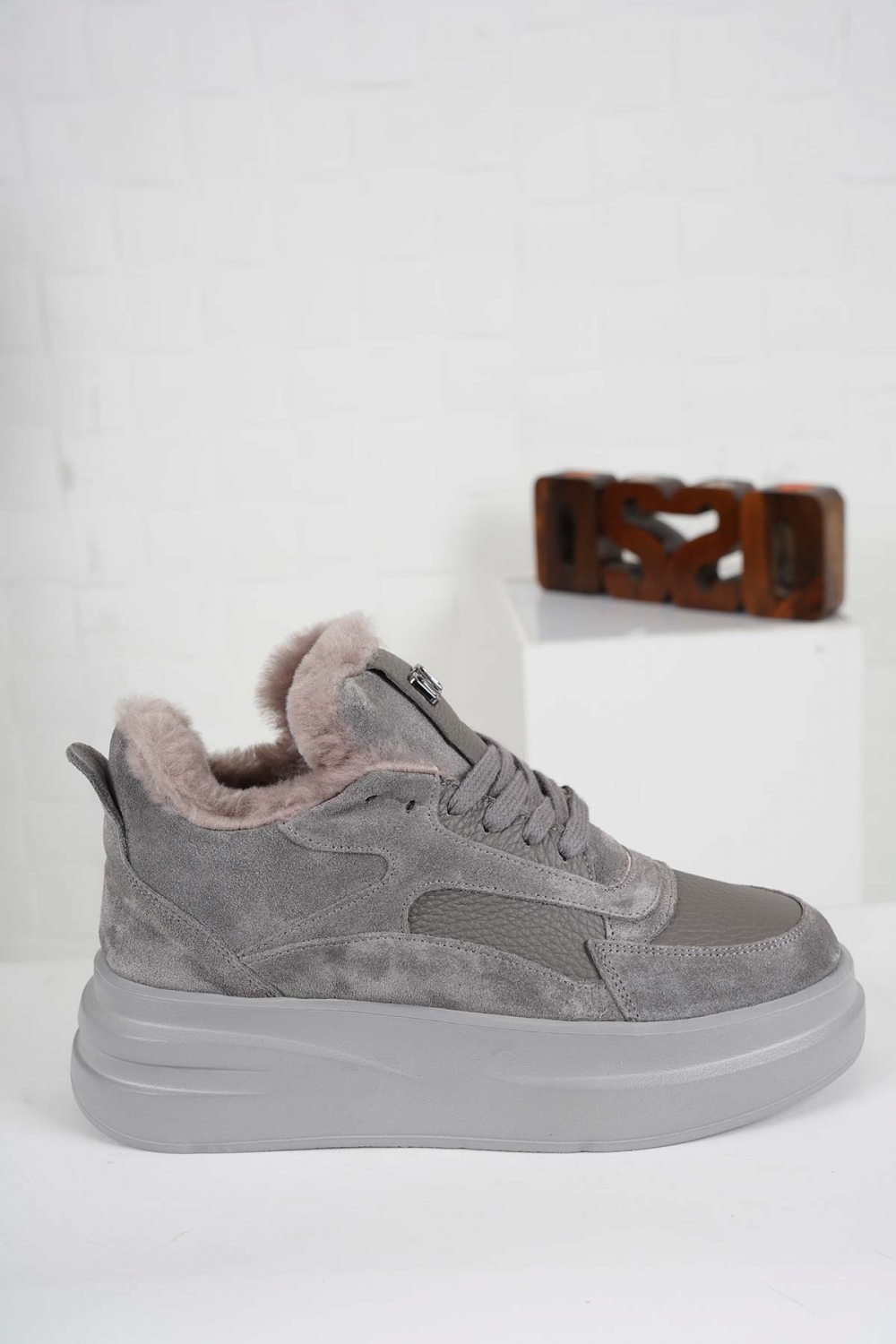Hakiki Deri Kürklü Gri Süet-Gri Kadın Sneaker Ayakkabı 232114103