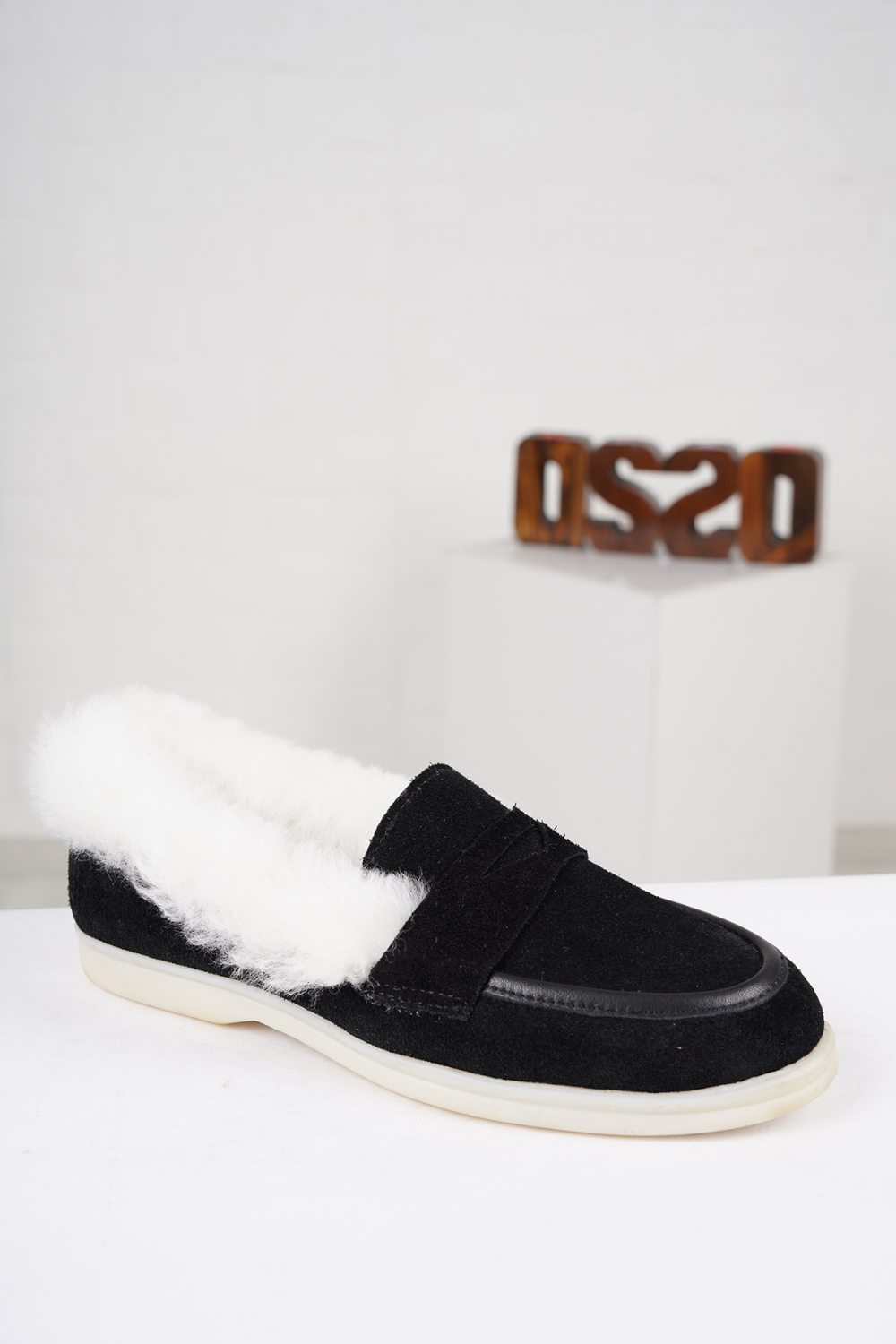 Hakiki Deri Kürklü Siyah Süet Kadın Loafer Ayakkabı 222121103