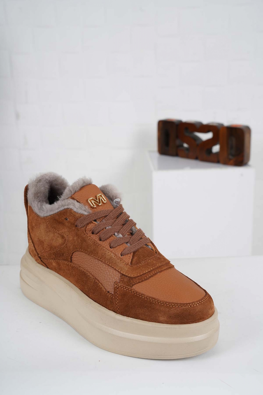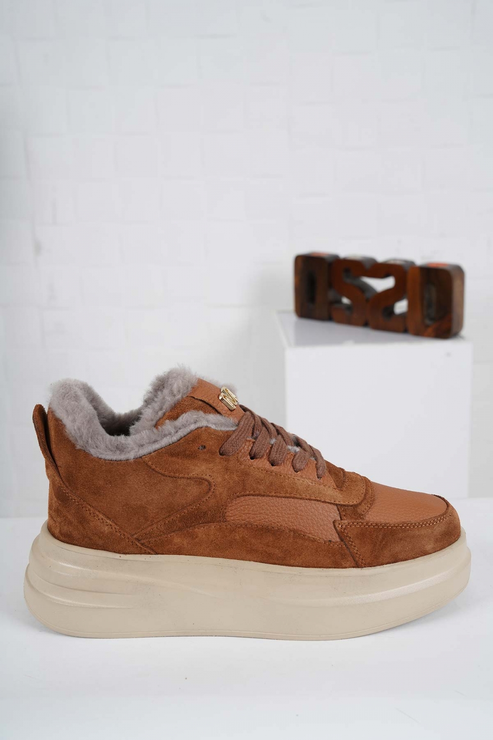 Hakiki Deri Kürklü Taba Süet-Taba Floter Kadın Sneaker Ayakkabı 232114103