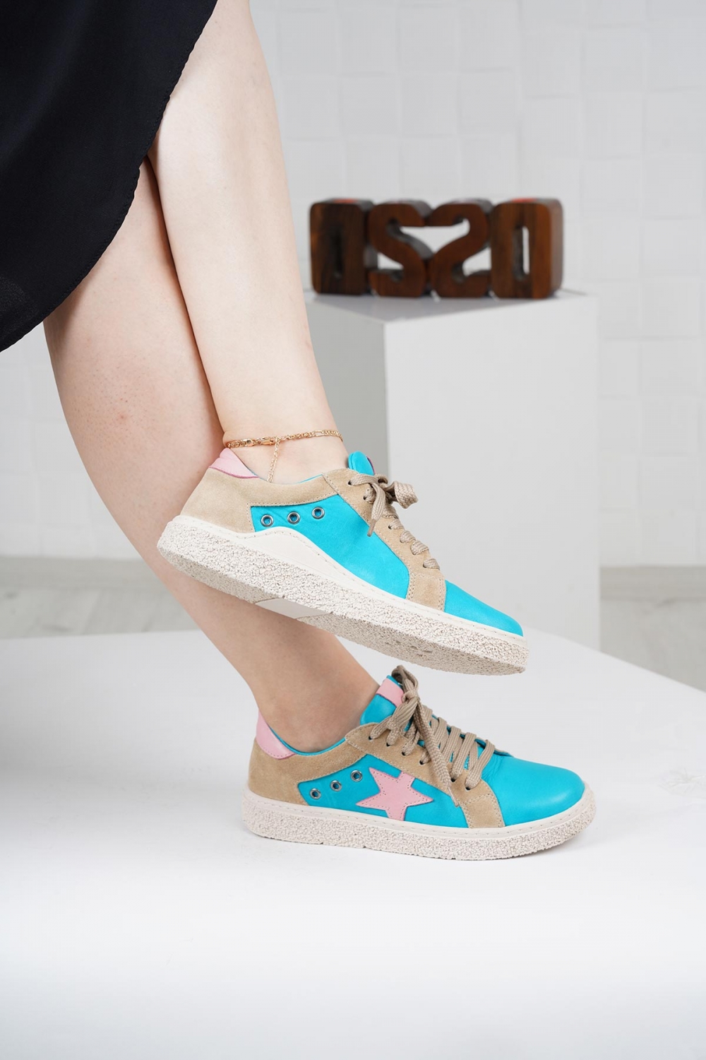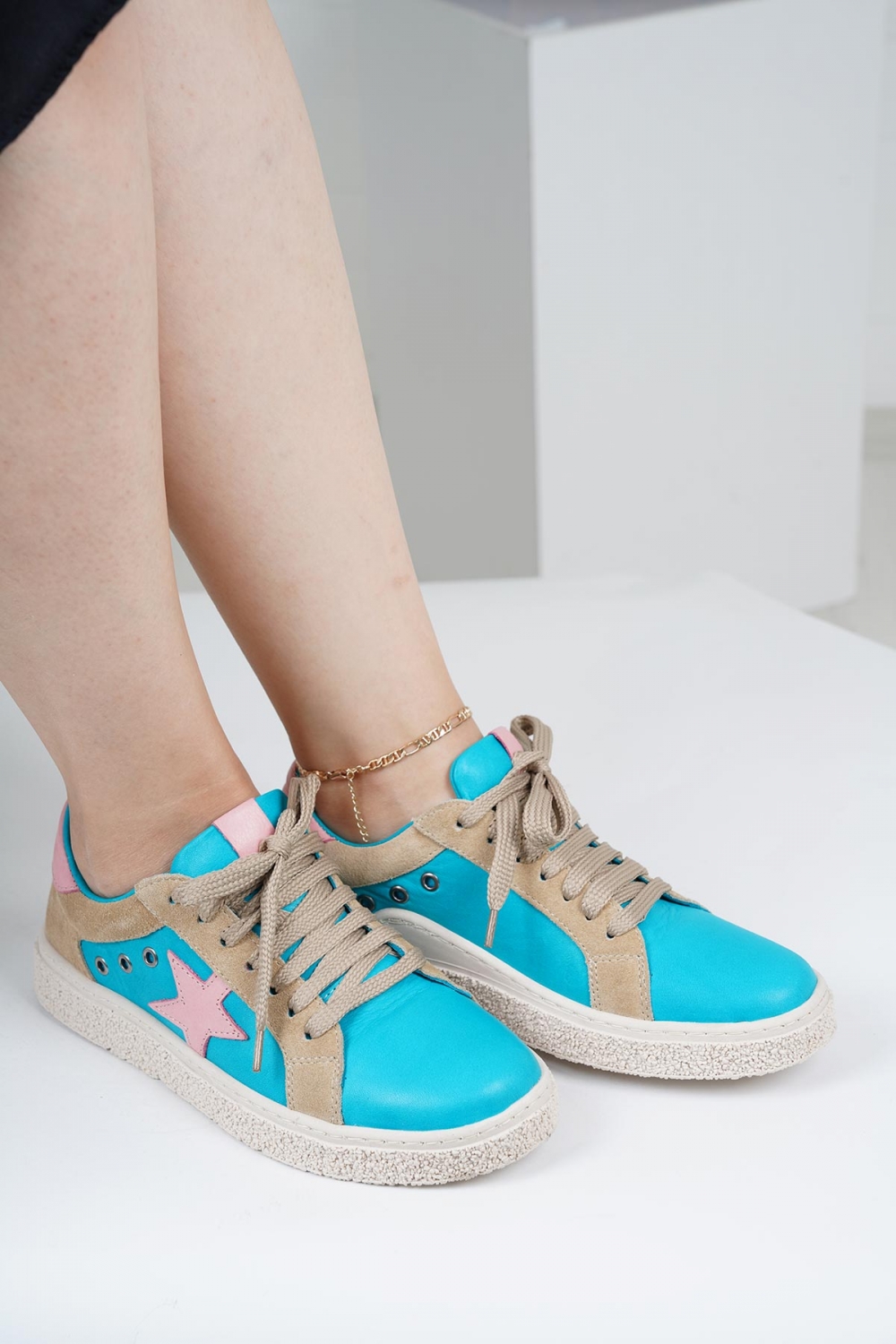 Hakiki Deri Mavi-Bej Süet-Pembe Kadın Spor Ayakkabı 222220103