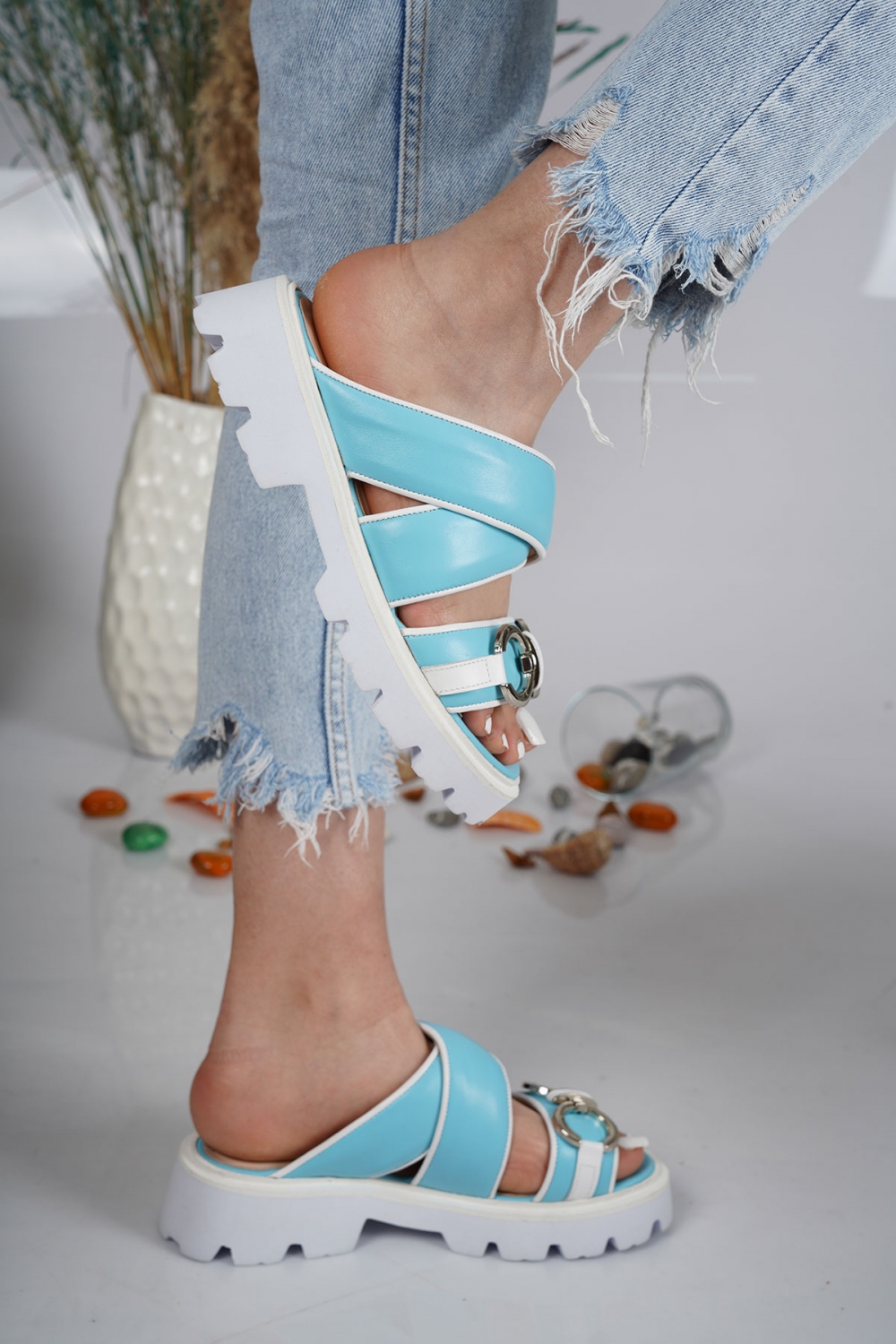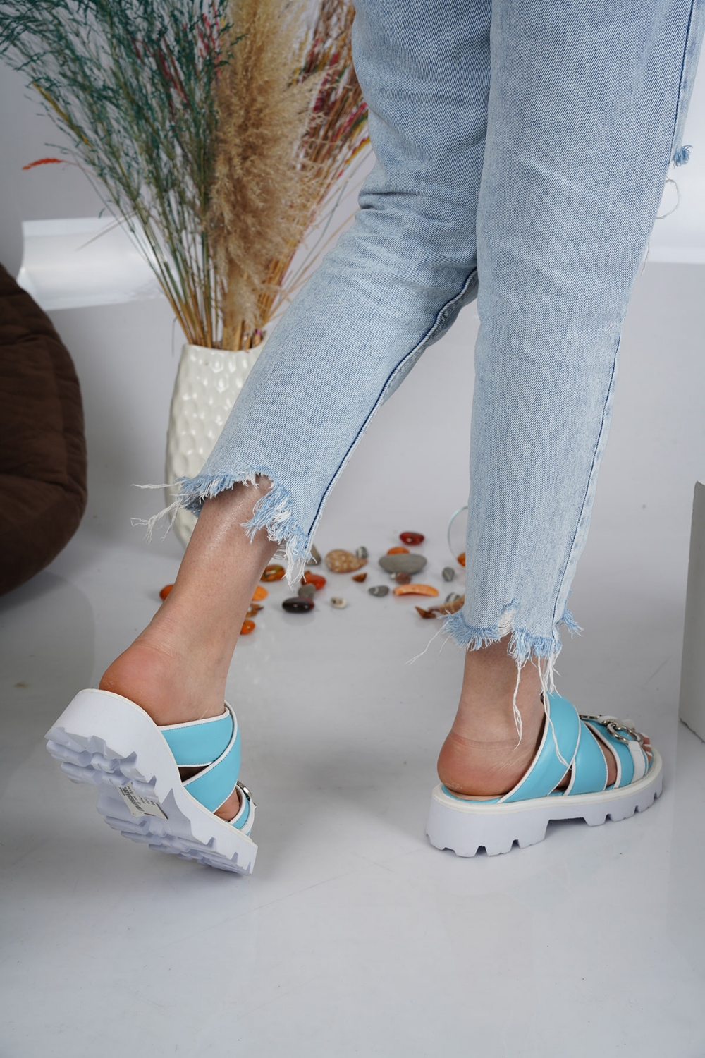 Hakiki Deri Mavi-Beyaz Kadın Casual Terlik 231127603