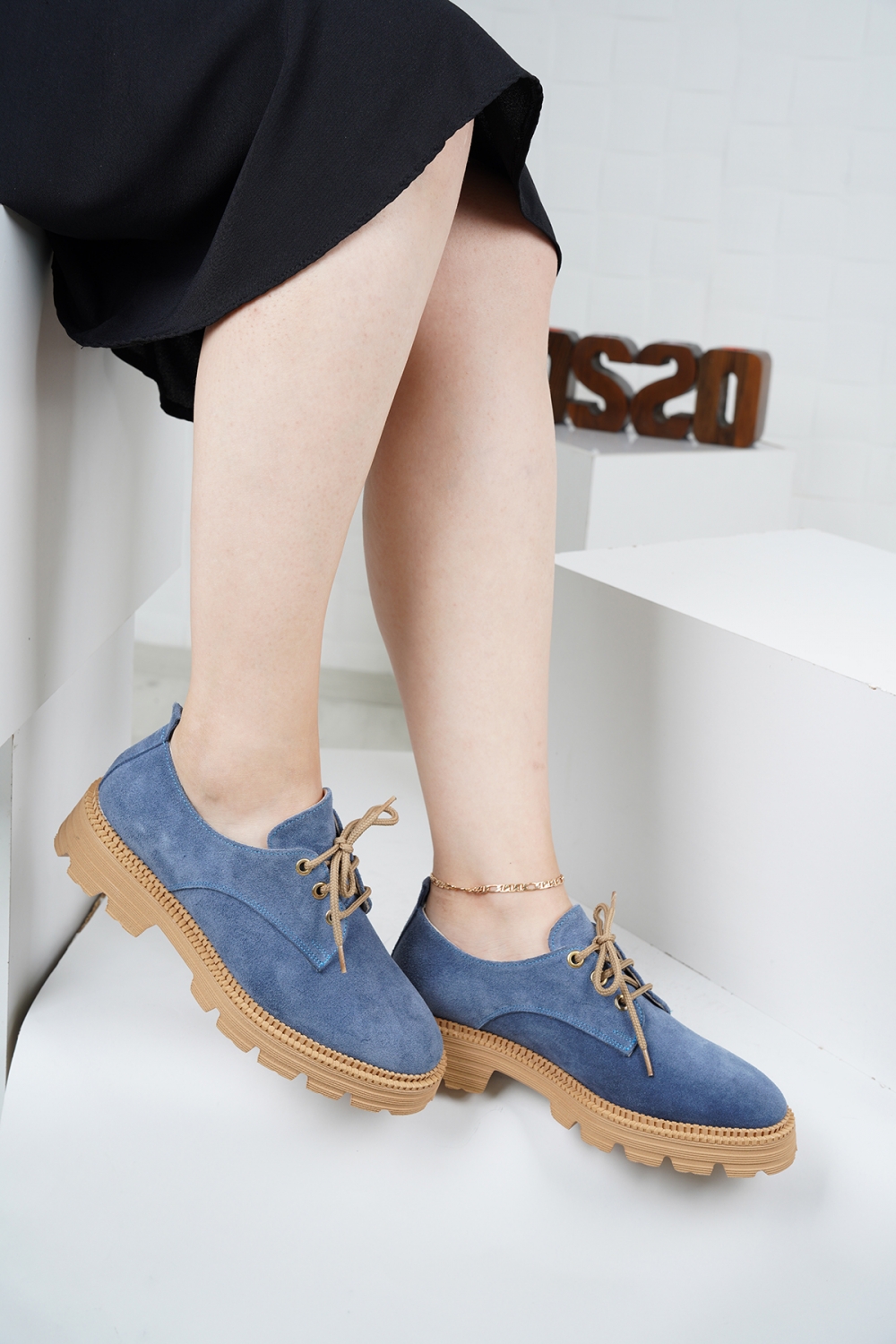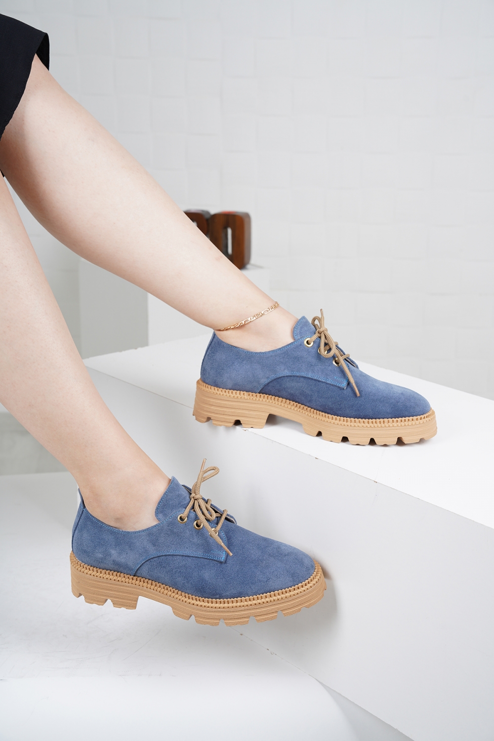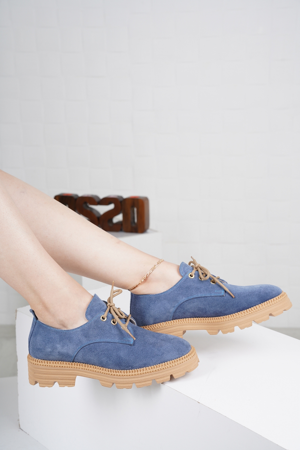 Hakiki Deri Mavi Süet Kadın Oxford Ayakkabı 222127101