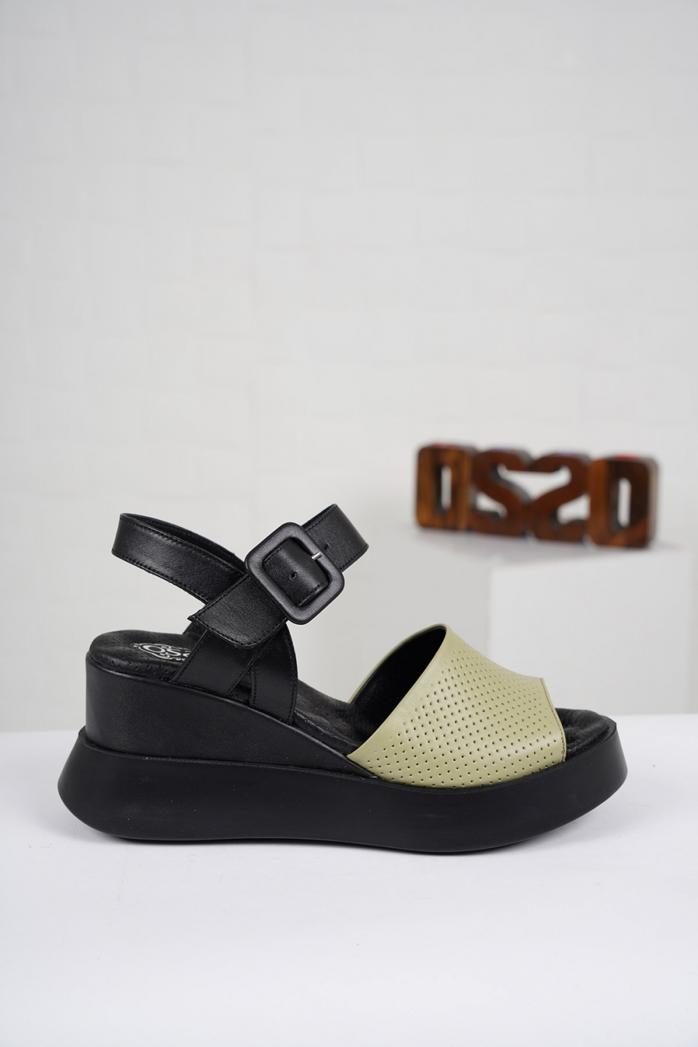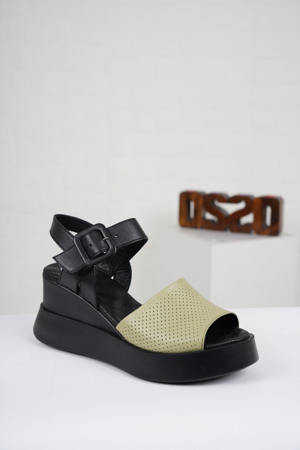Hakiki Deri Siyah-Avokado Kadın Dolgu Topuk Sandalet 221229504