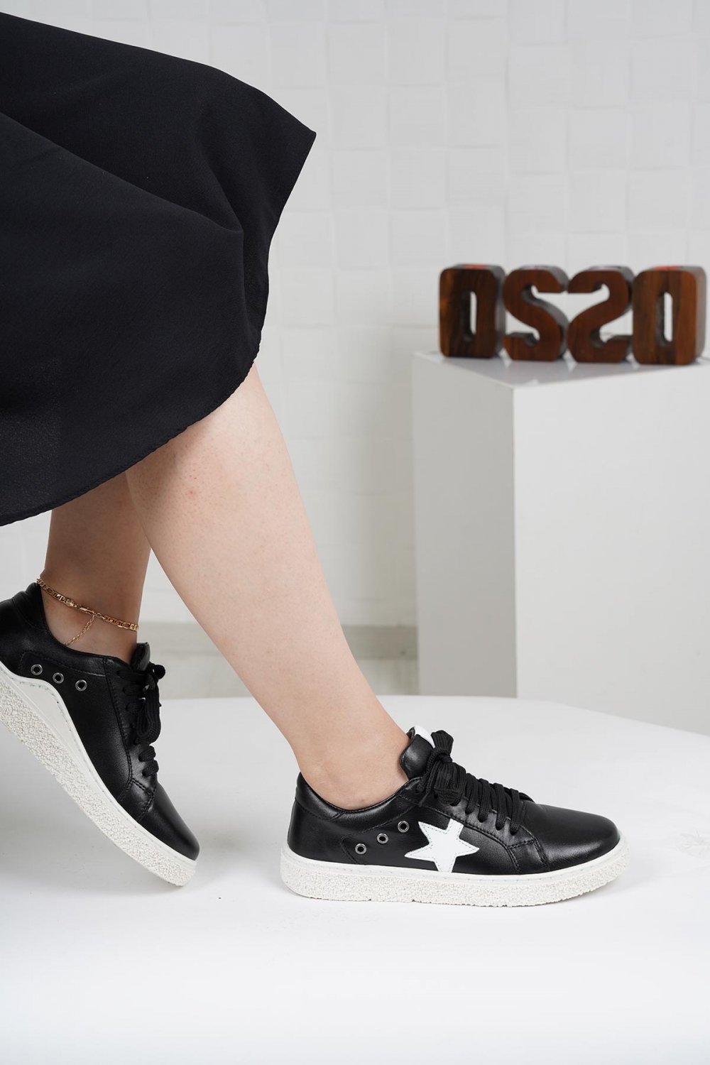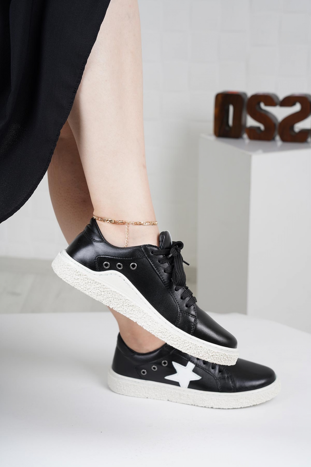 Hakiki Deri Siyah Beyaz Kadın Spor Ayakkabı 222220103