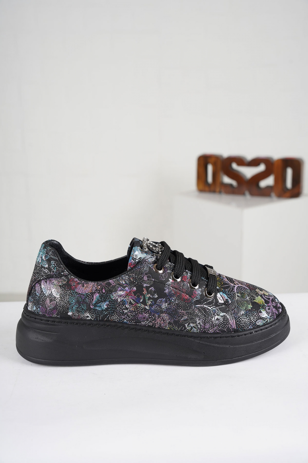 Hakiki Deri Siyah Çiçek Baskı Kadın Sneaker Ayakkabı 222176102