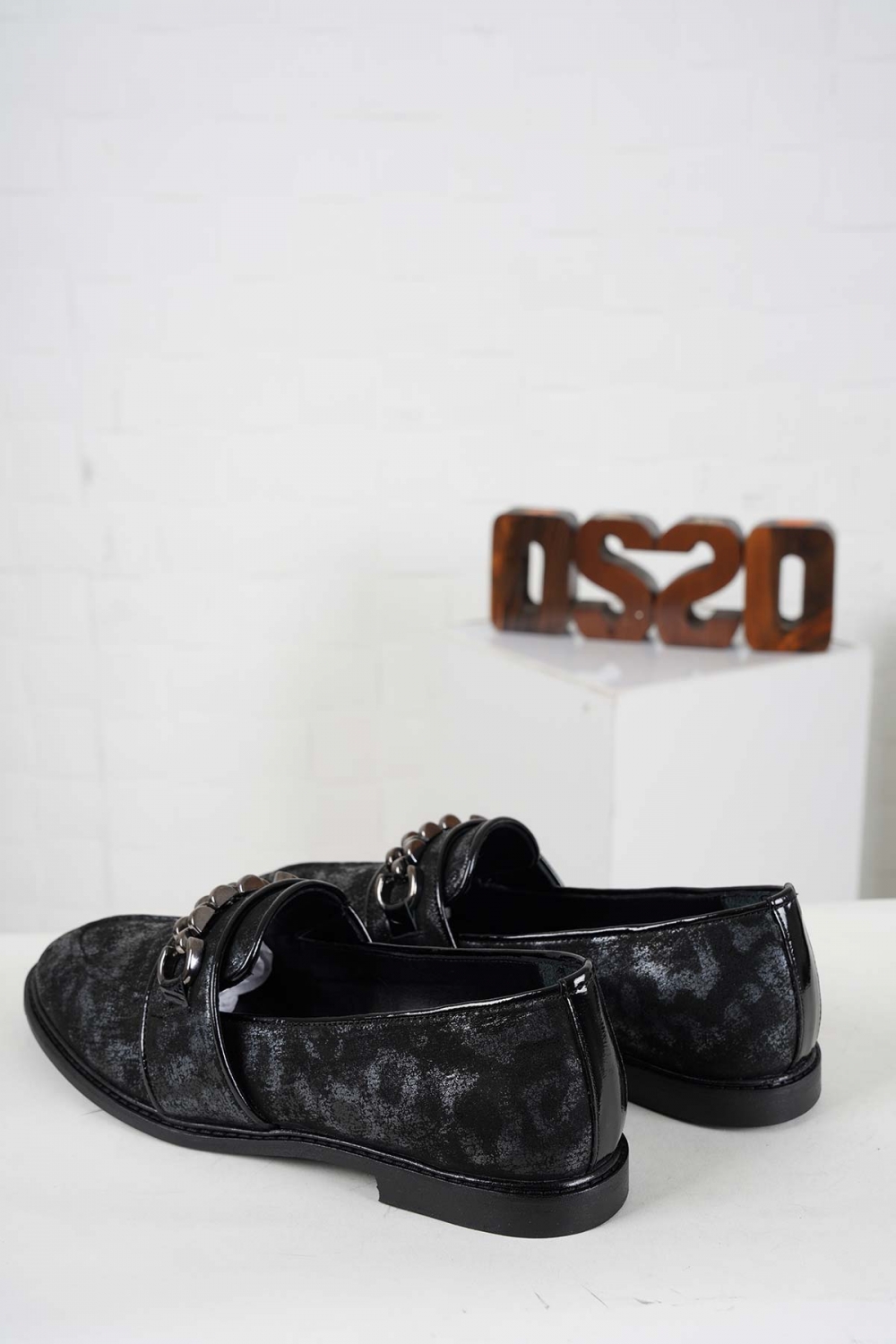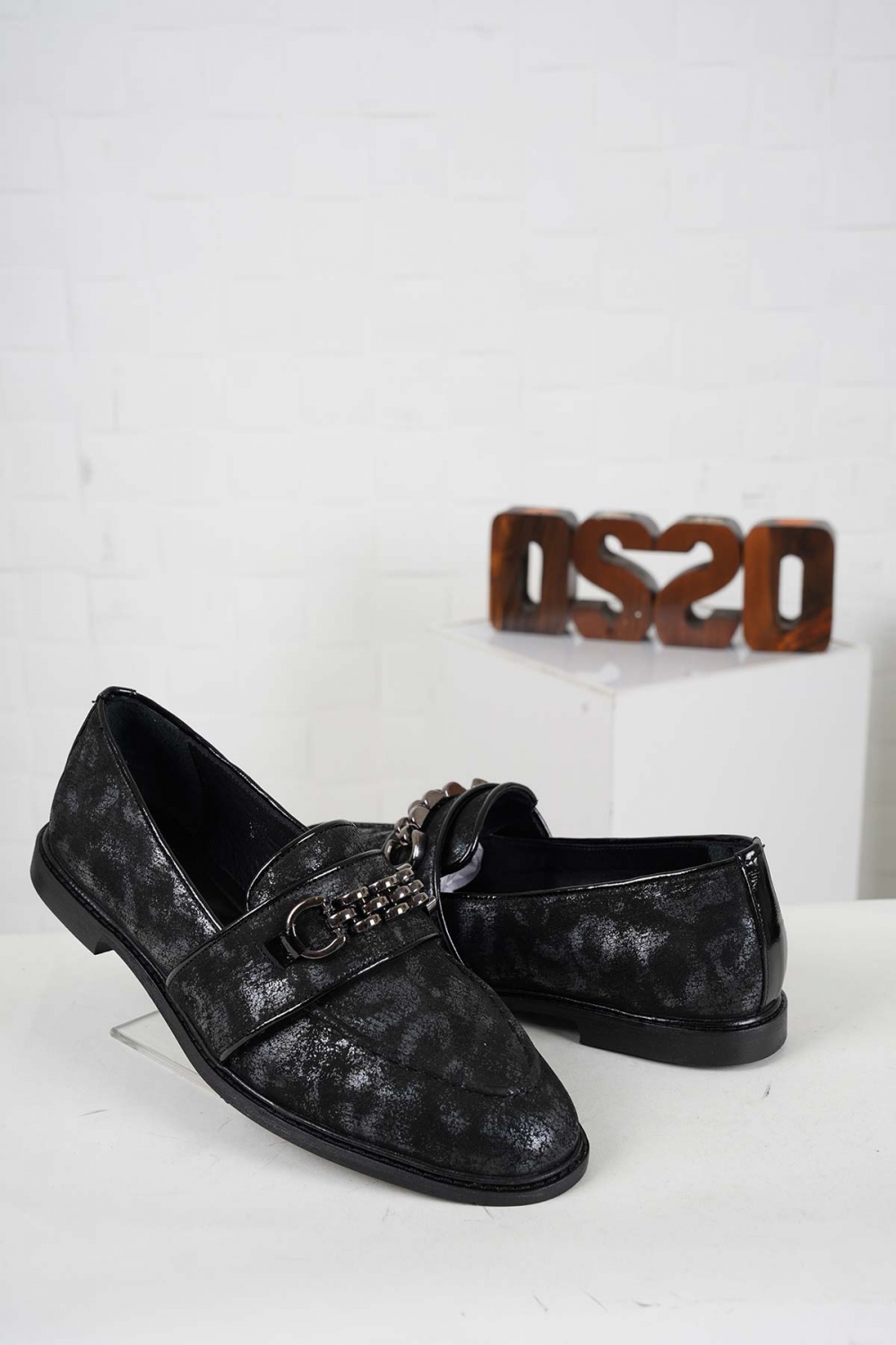 Hakiki Deri Siyah Gri Baskılı-Siyah Rugan Kadın Casual Ayakkabı 242127103