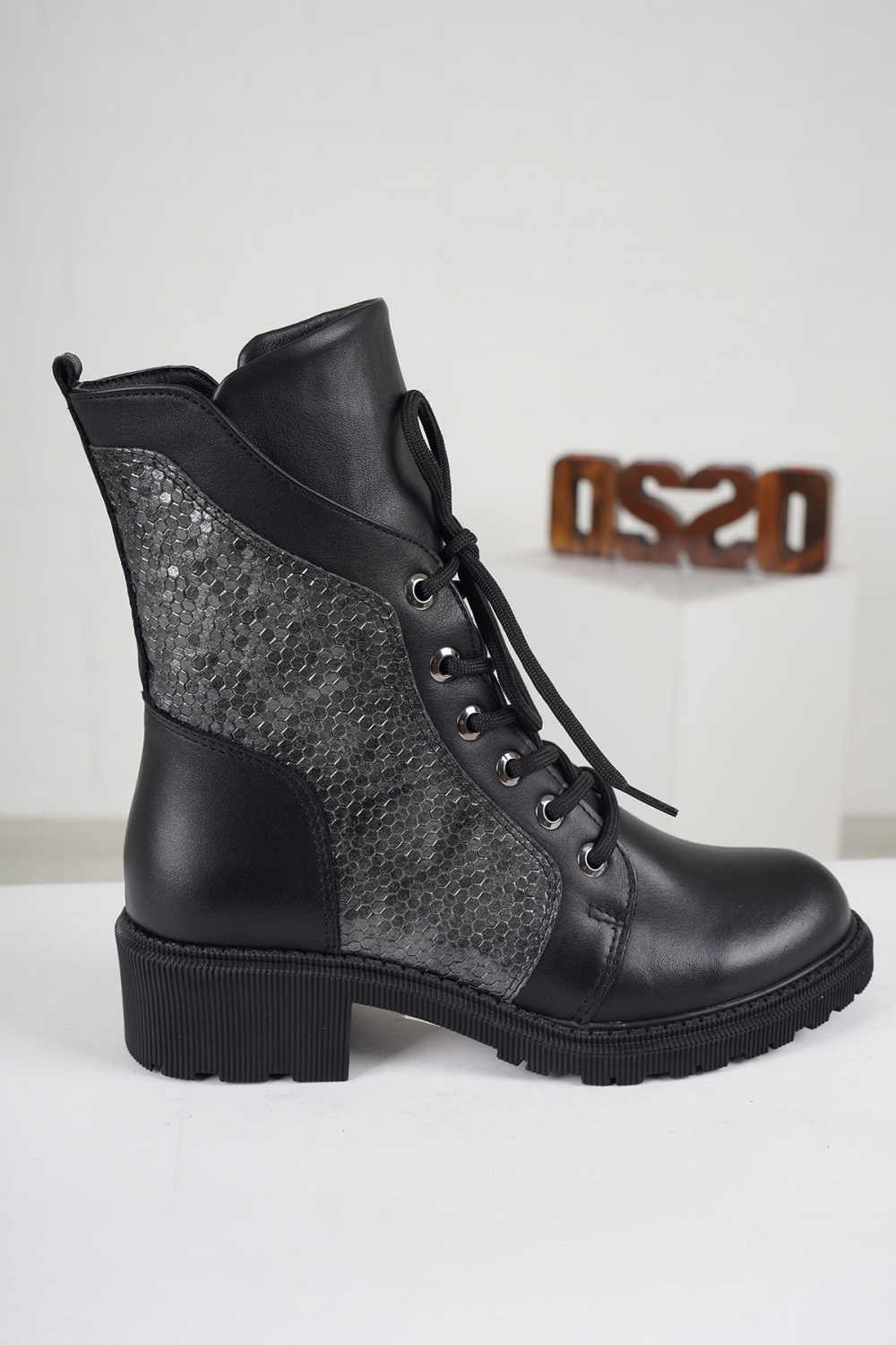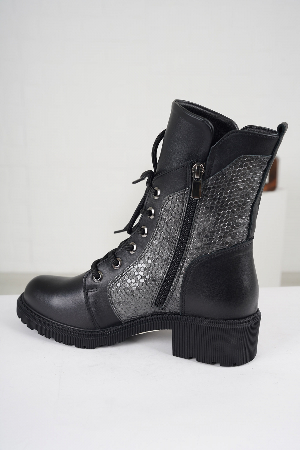 Hakiki Deri Siyah-Gri Petek Kadın Kısa Bot 222176204
