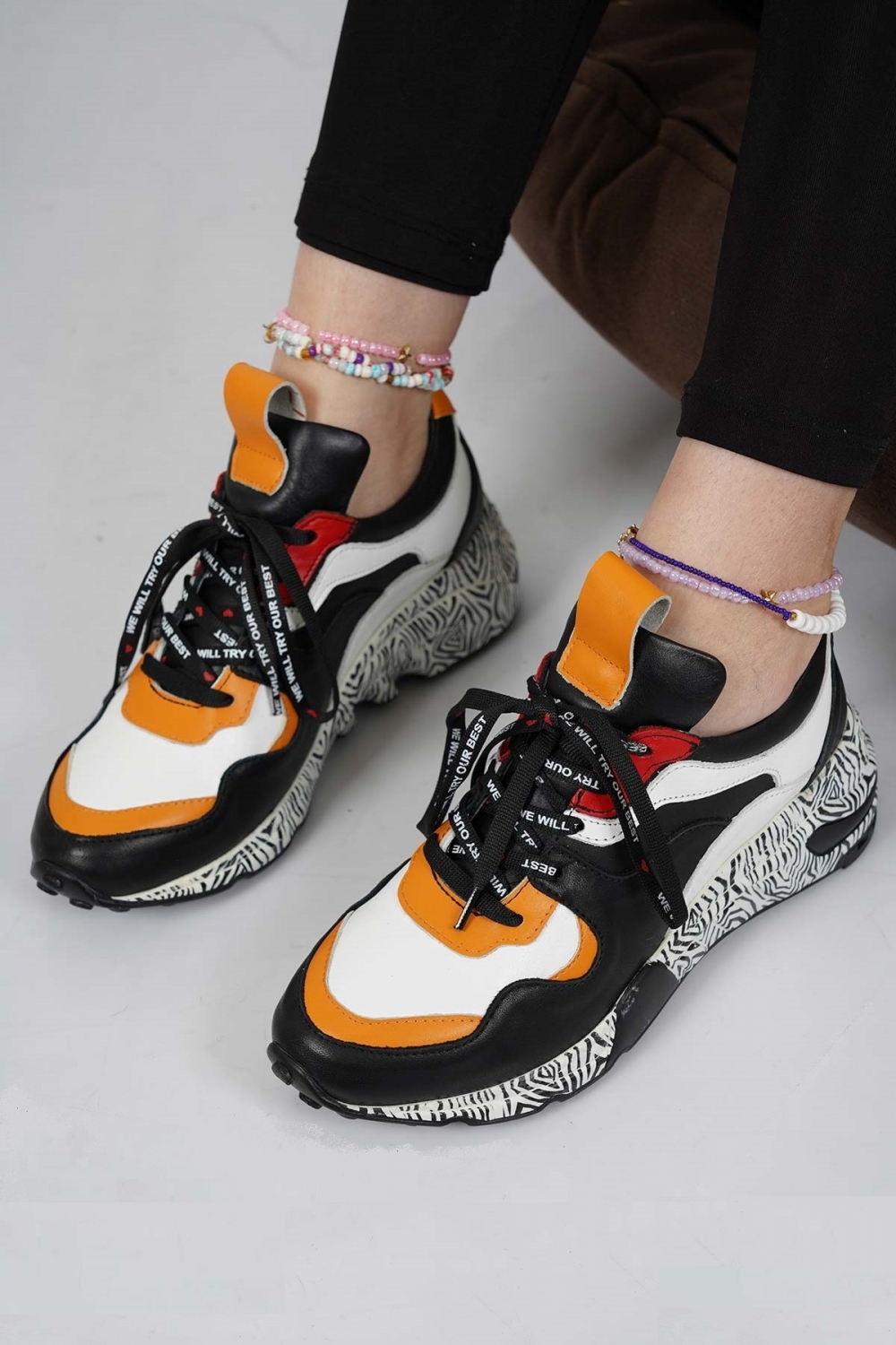 Hakiki Deri Siyah-Hardal-Beyaz-Kırmızı Kadın Sneaker Ayakkabı 202110108