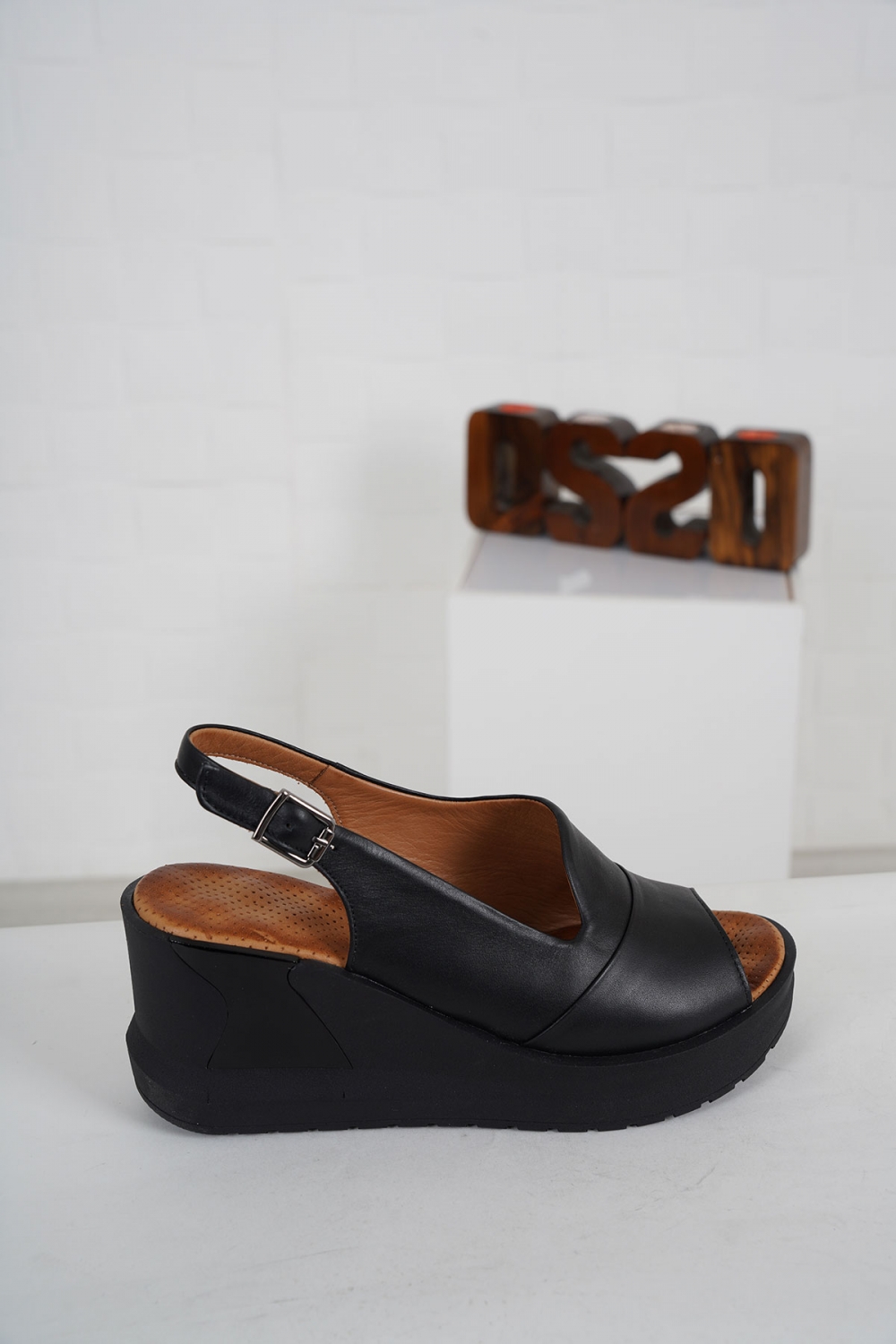 Hakiki Deri Siyah Kadın Dolgu Topuk Sandalet 231229501
