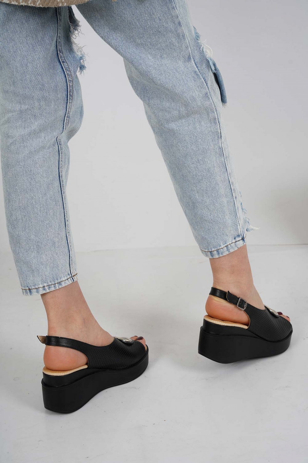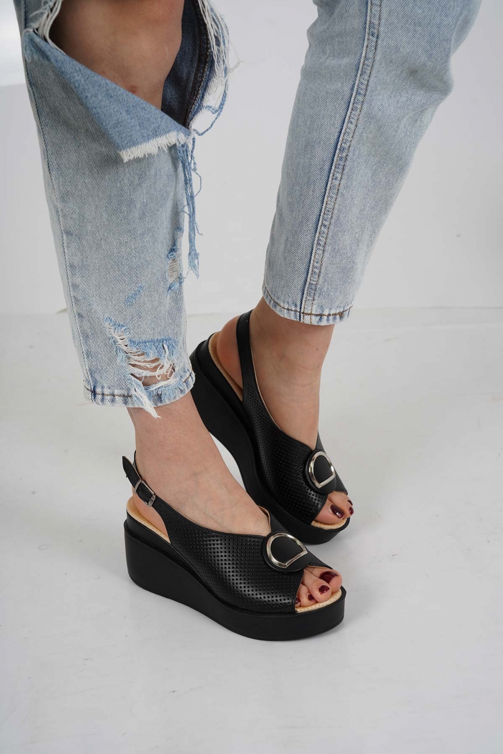 Hakiki Deri Siyah Kadın Dolgu Topuk Sandalet 231229508
