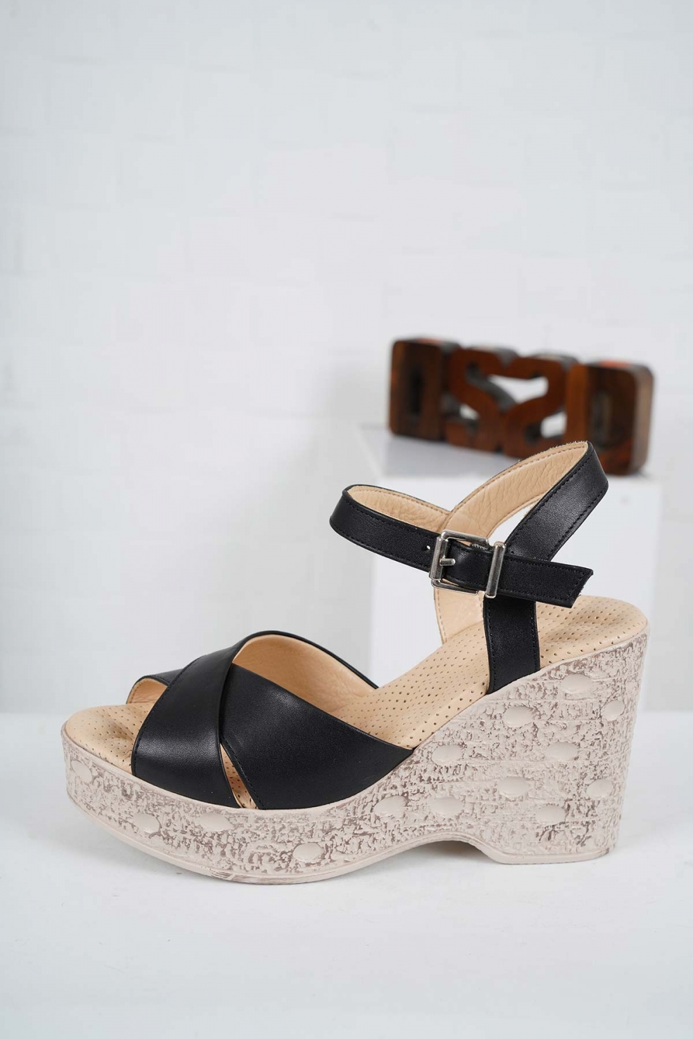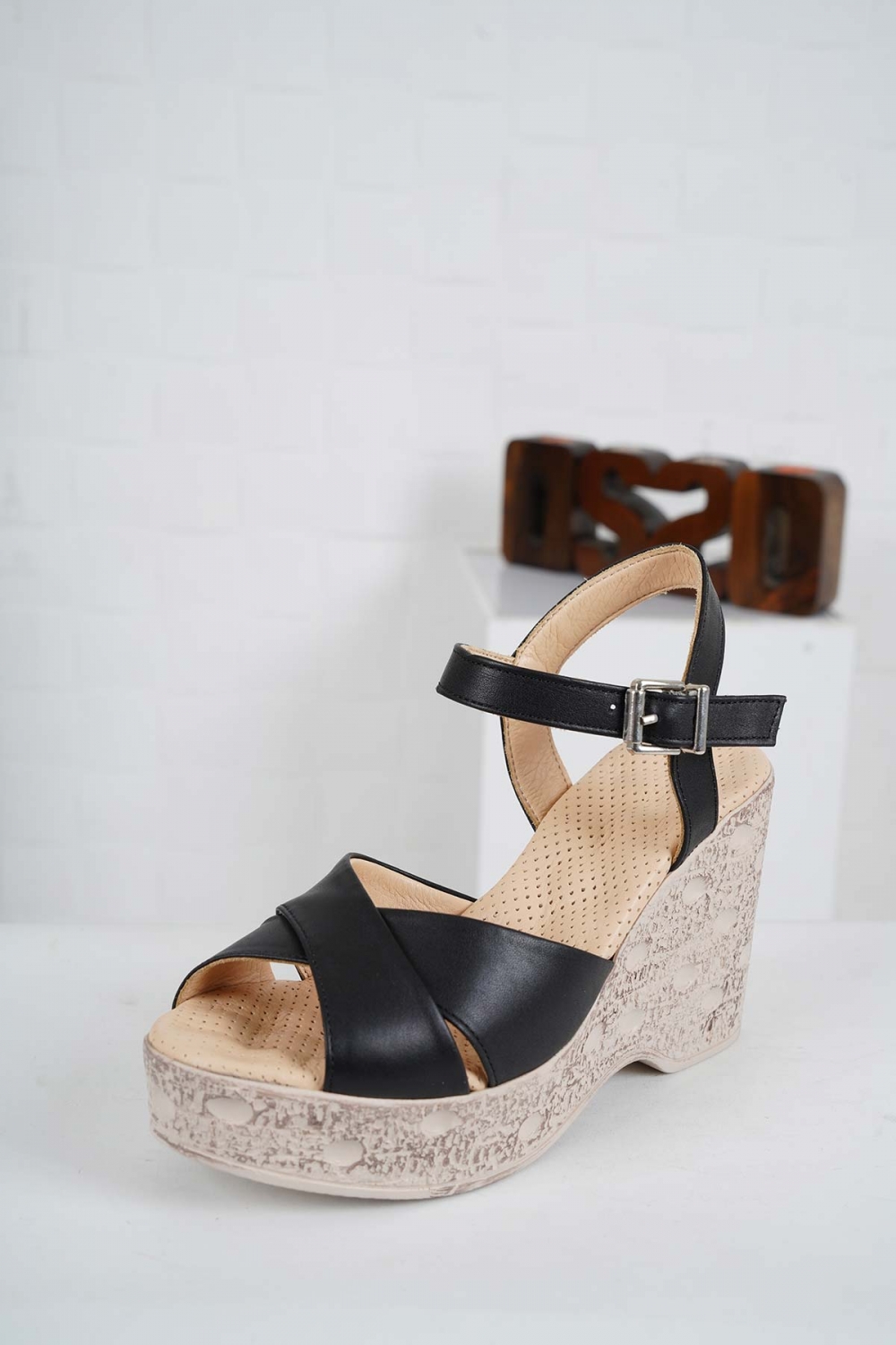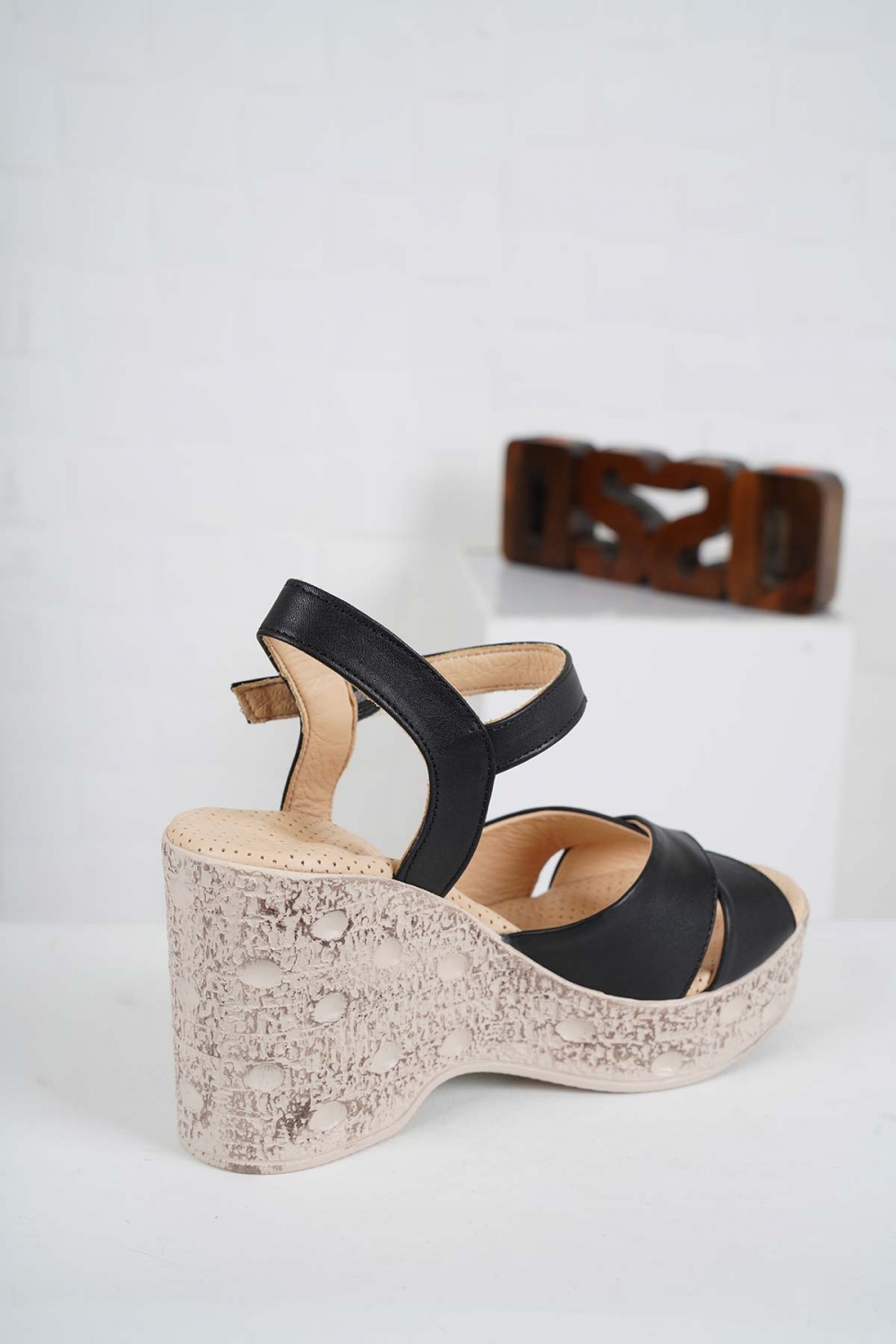 Hakiki Deri Siyah Kadın Dolgu Topuk Sandalet 241136501