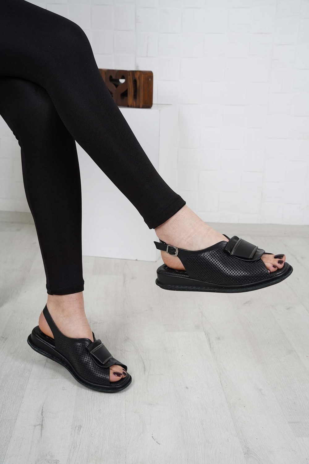 Hakiki Deri Siyah Kadın Düz Sandalet 231100501