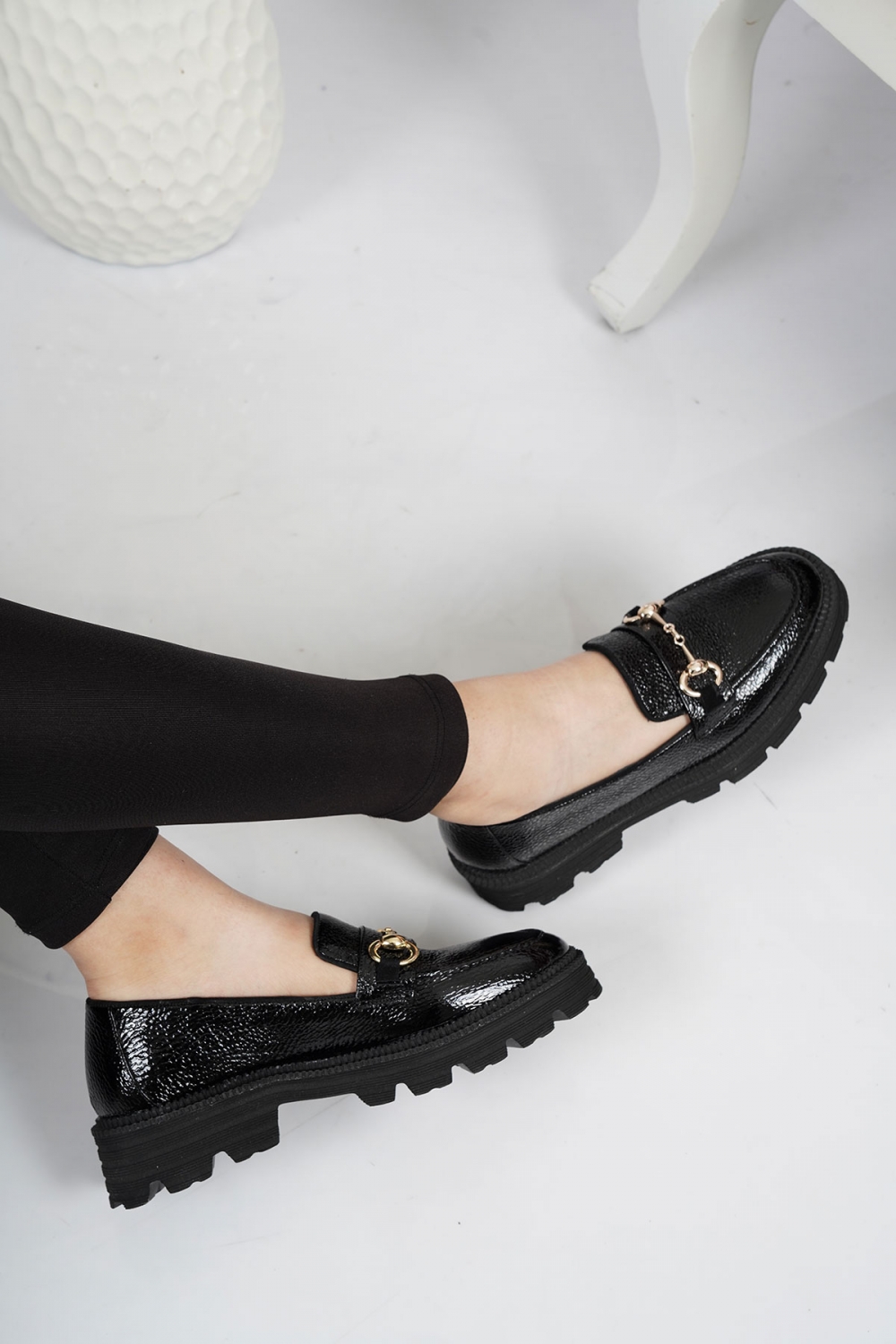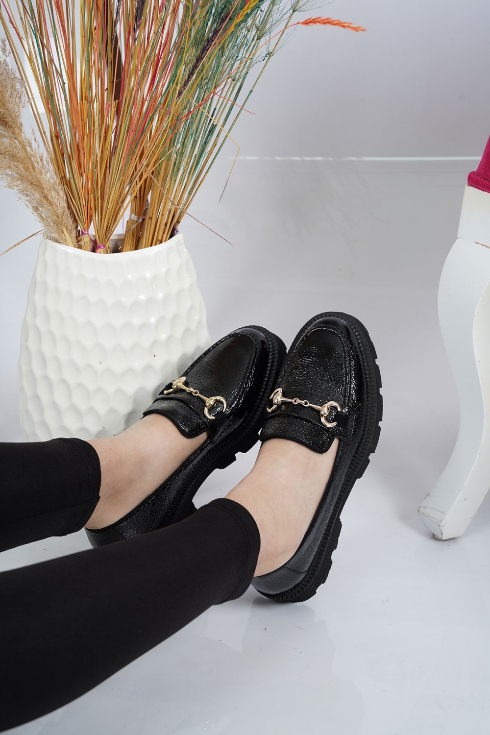 Hakiki Deri Siyah Kırışık Rugan Kadın Casual Ayakkabı 231127101