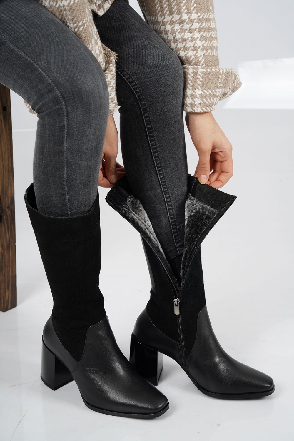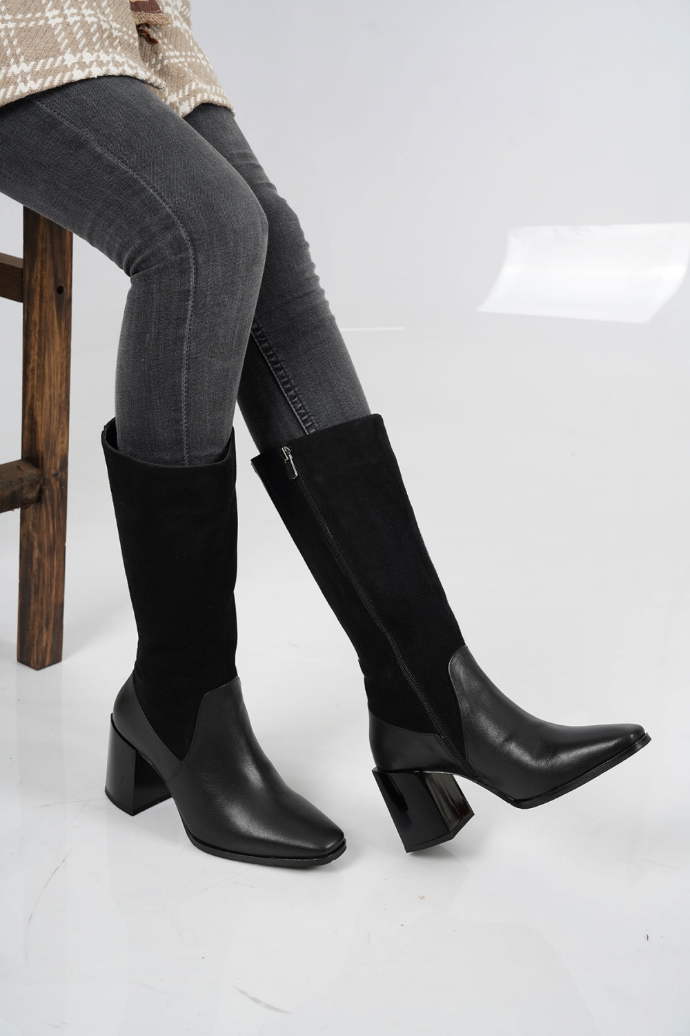 Hakiki Deri Siyah Nubuk-Siyah Kadın Topuklu Çizme 212127314