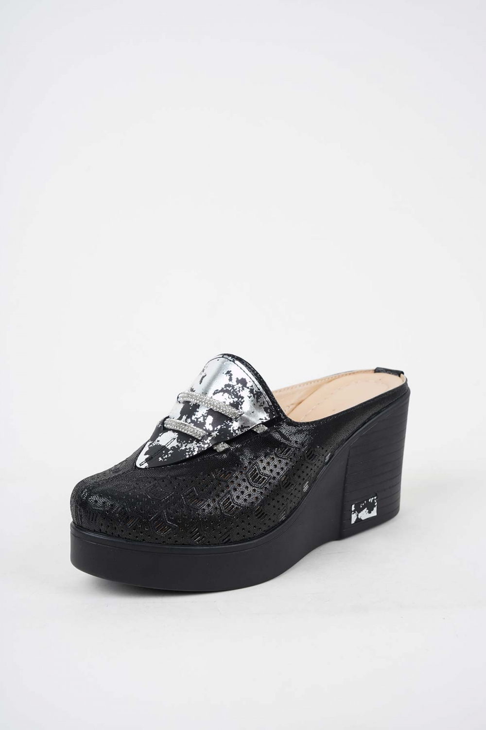 Hakiki Deri Siyah Saten-Baskı Kadın Dolgu Topuklu Sabo 251189702