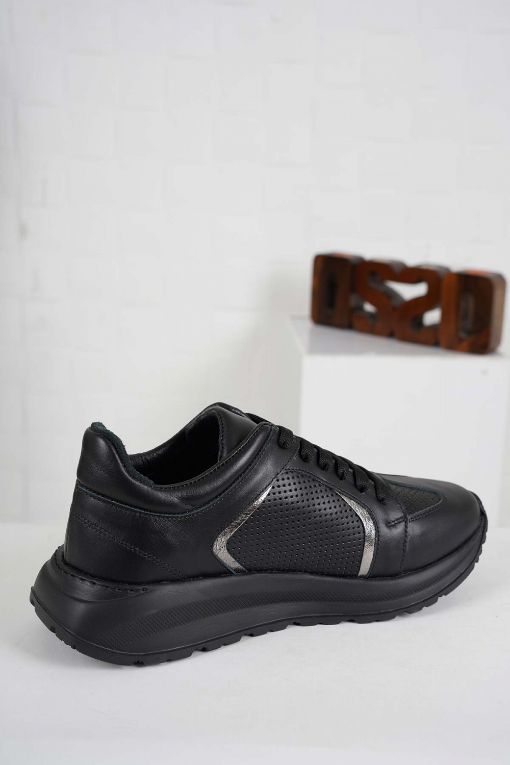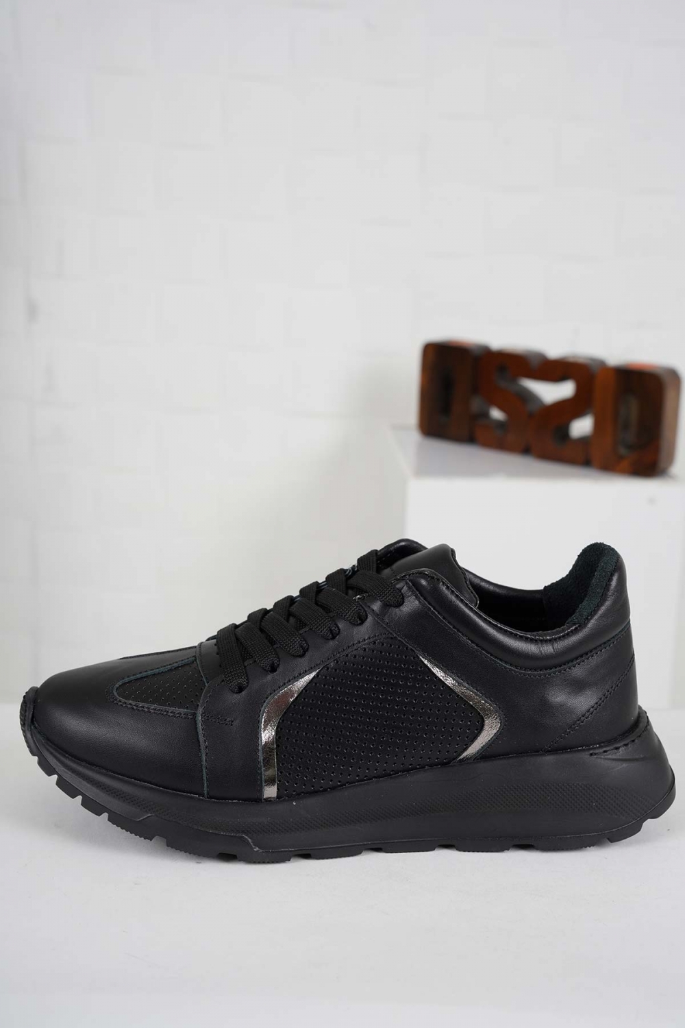 Hakiki Deri Siyah-Siyah Nikel Kadın Sneaker Ayakkabı 241218106