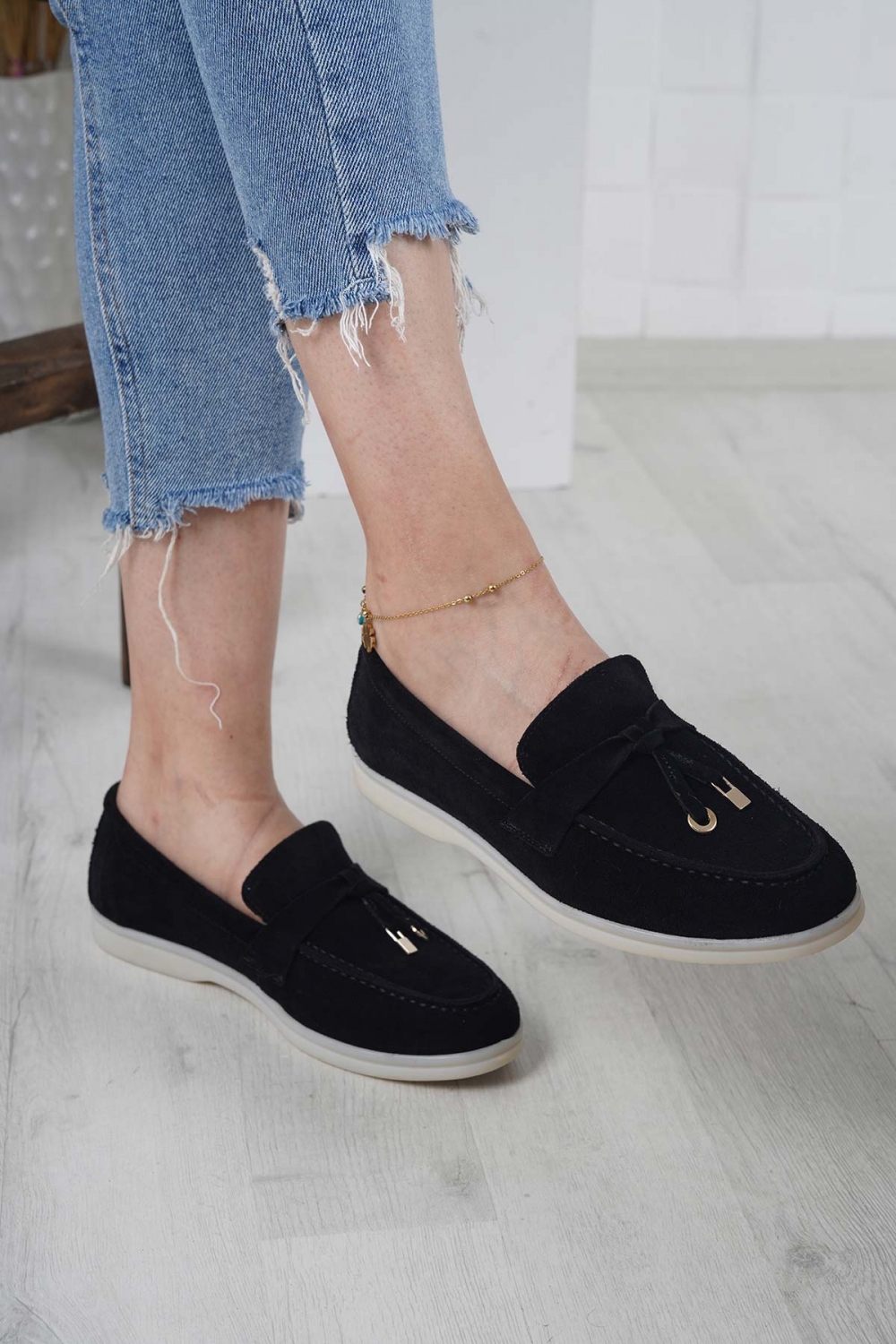 Hakiki Deri Siyah Süet Kadın Makosen Ayakkabı 231110103