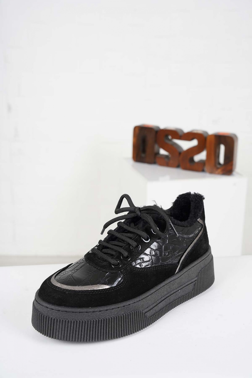 Hakiki Deri Siyah Süet-Siyah Kroko Kadın Sneaker Ayakkabı 232225104