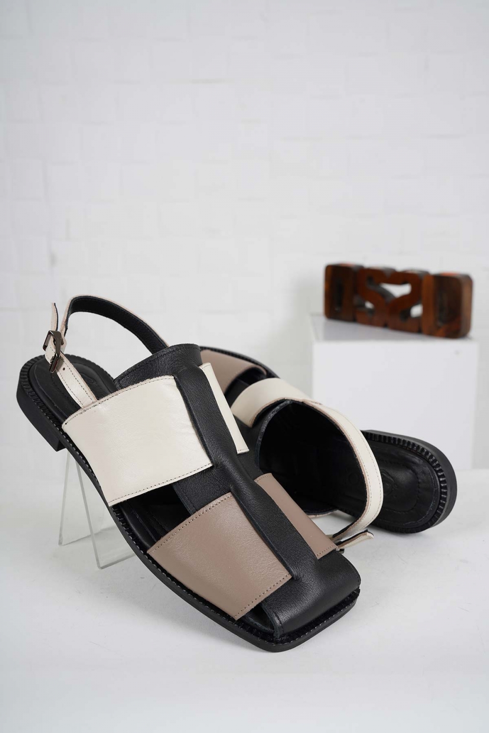 Hakiki Deri Siyah-Vizon-Bej Kadın Burun Kapalı Sandalet 241127509
