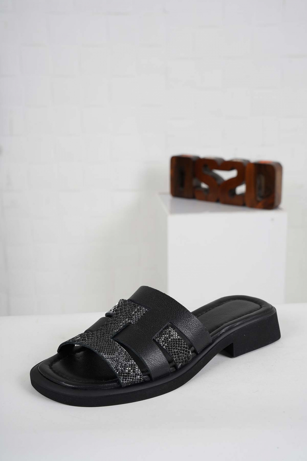Hakiki Deri Siyah-Yılan Baskı Kadın Alçak Topuklu Terlik 241225601