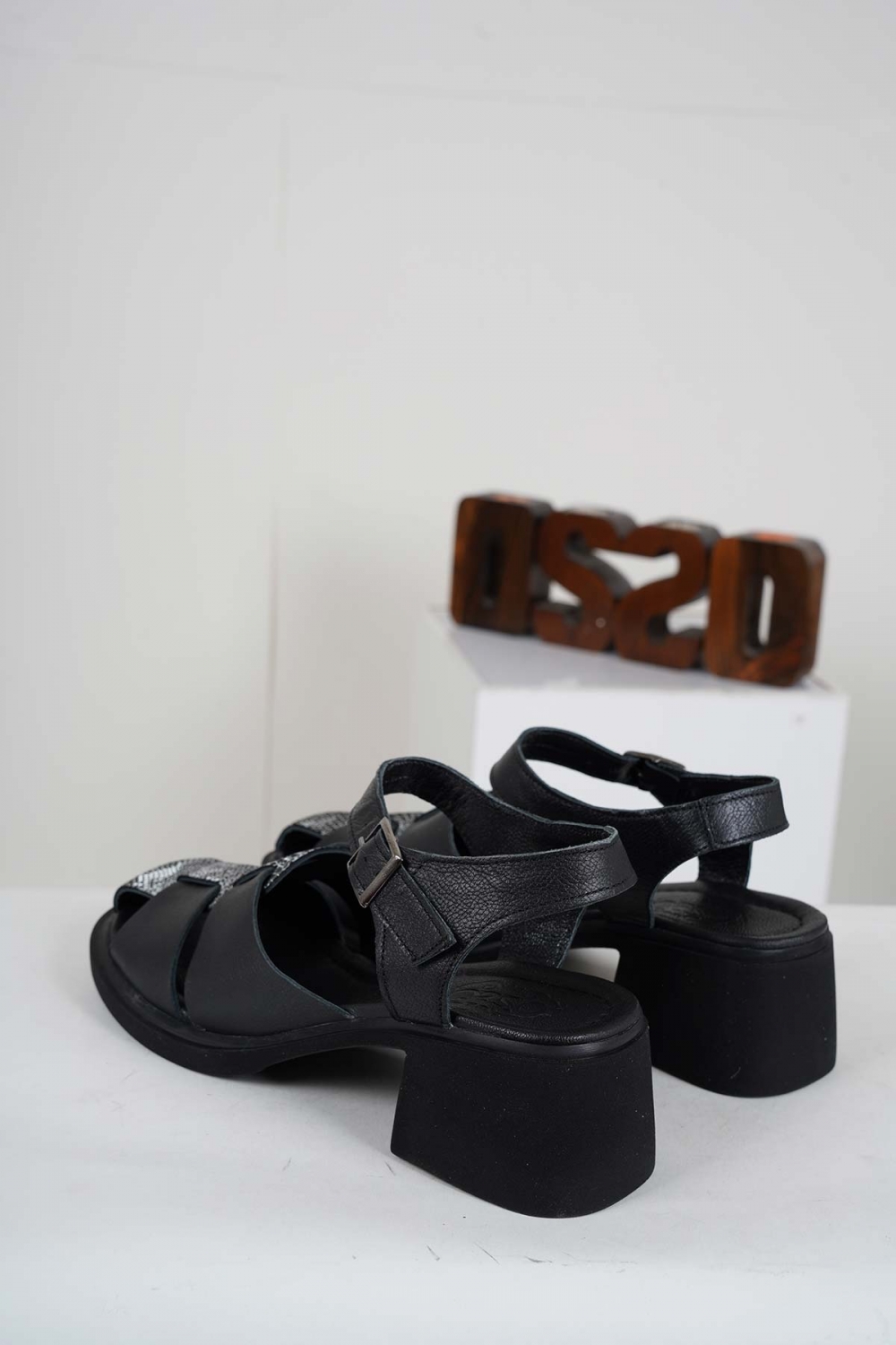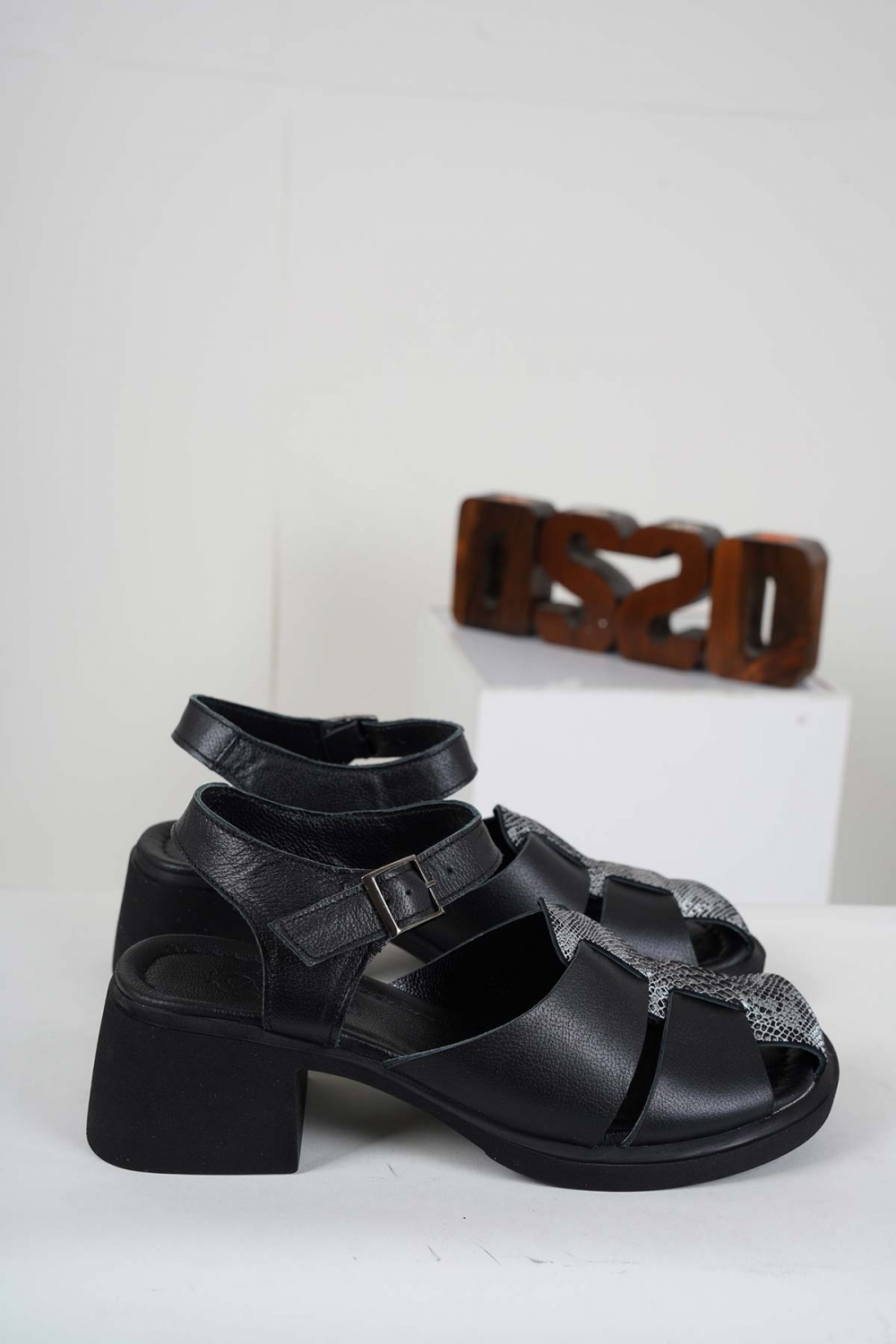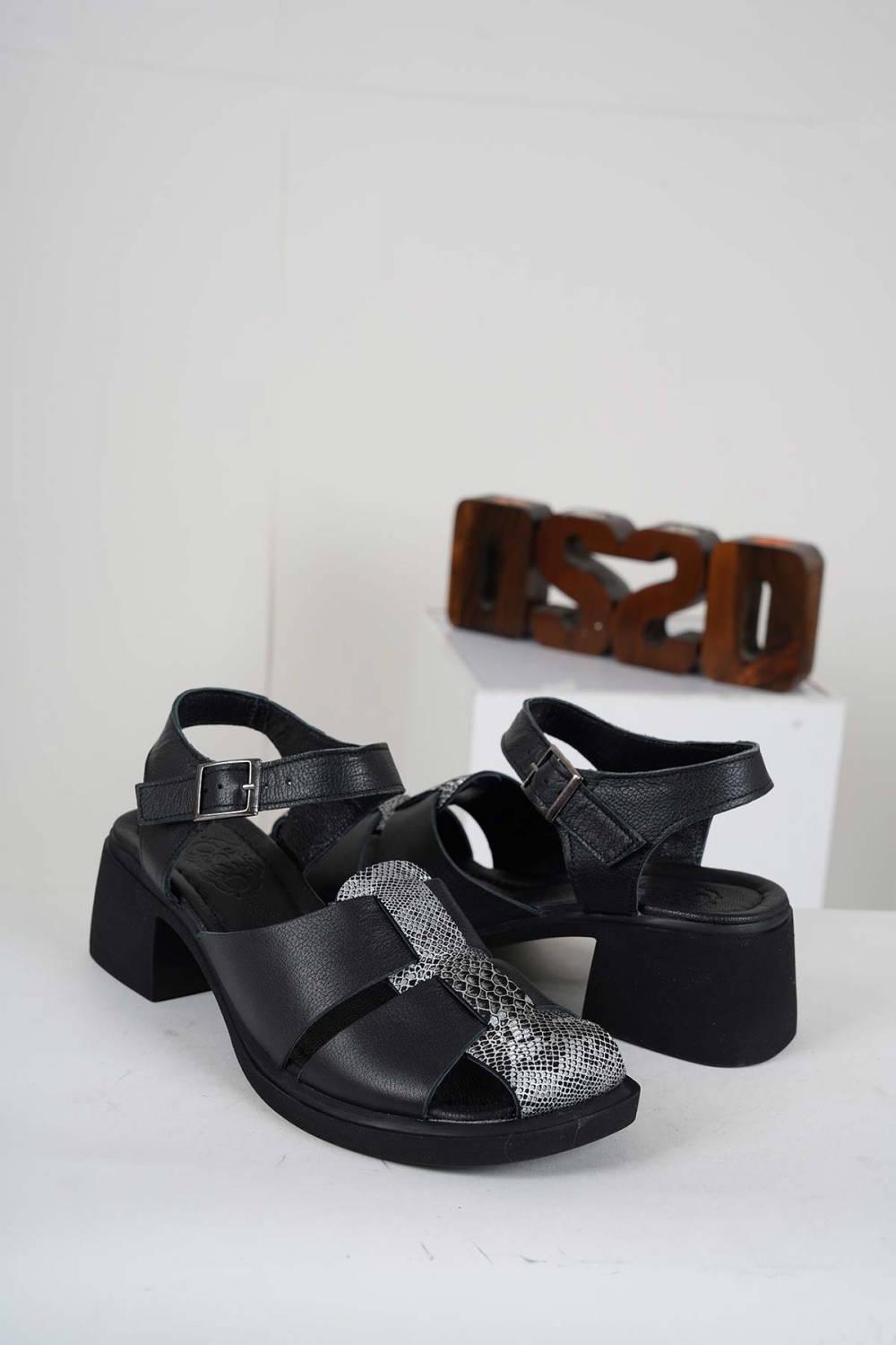 Hakiki Deri Siyah-Yılan Baskı Kadın Topuklu Sandalet 241225501