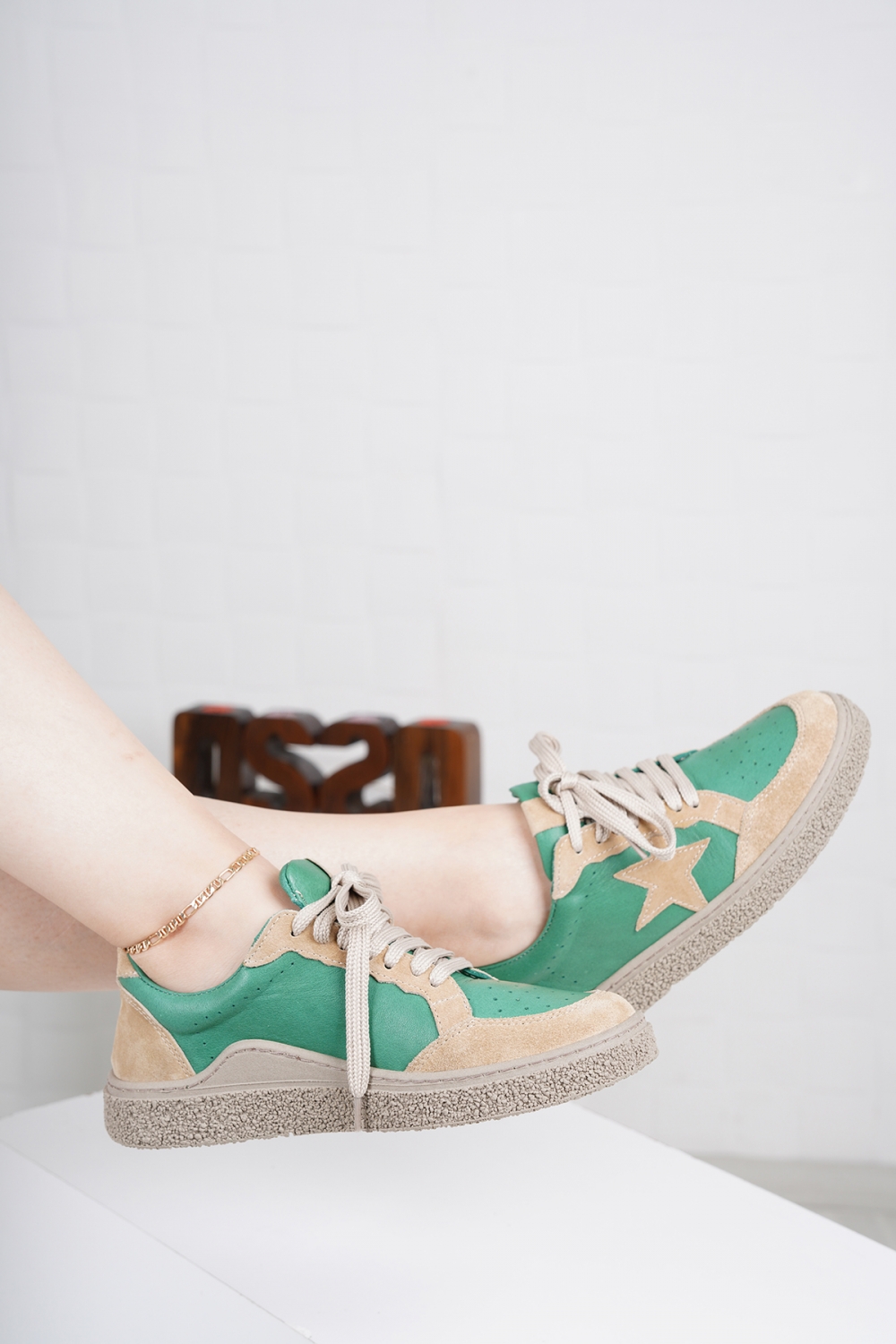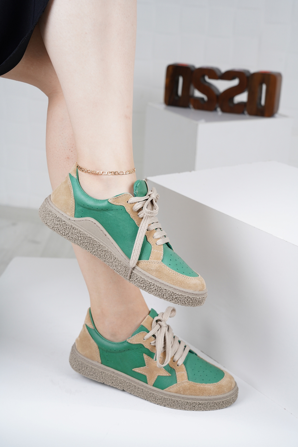Hakiki Deri Yeşil-Bej Süet Kadın Spor Ayakkabı 222220101