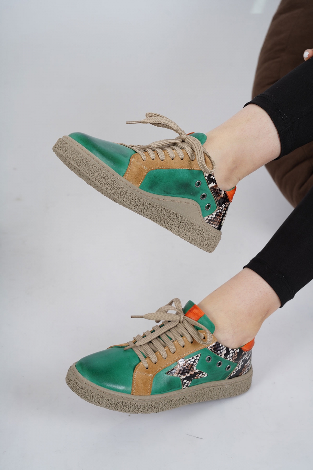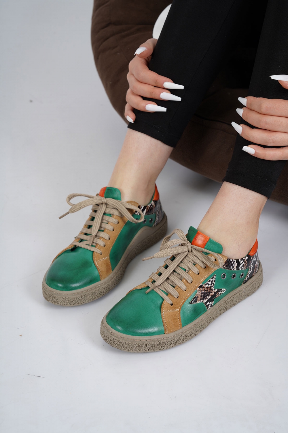 Hakiki Deri Yeşil-Bej Süet-Yeşil Yılan-Turuncu Kadın Spor Ayakkabı 222220103