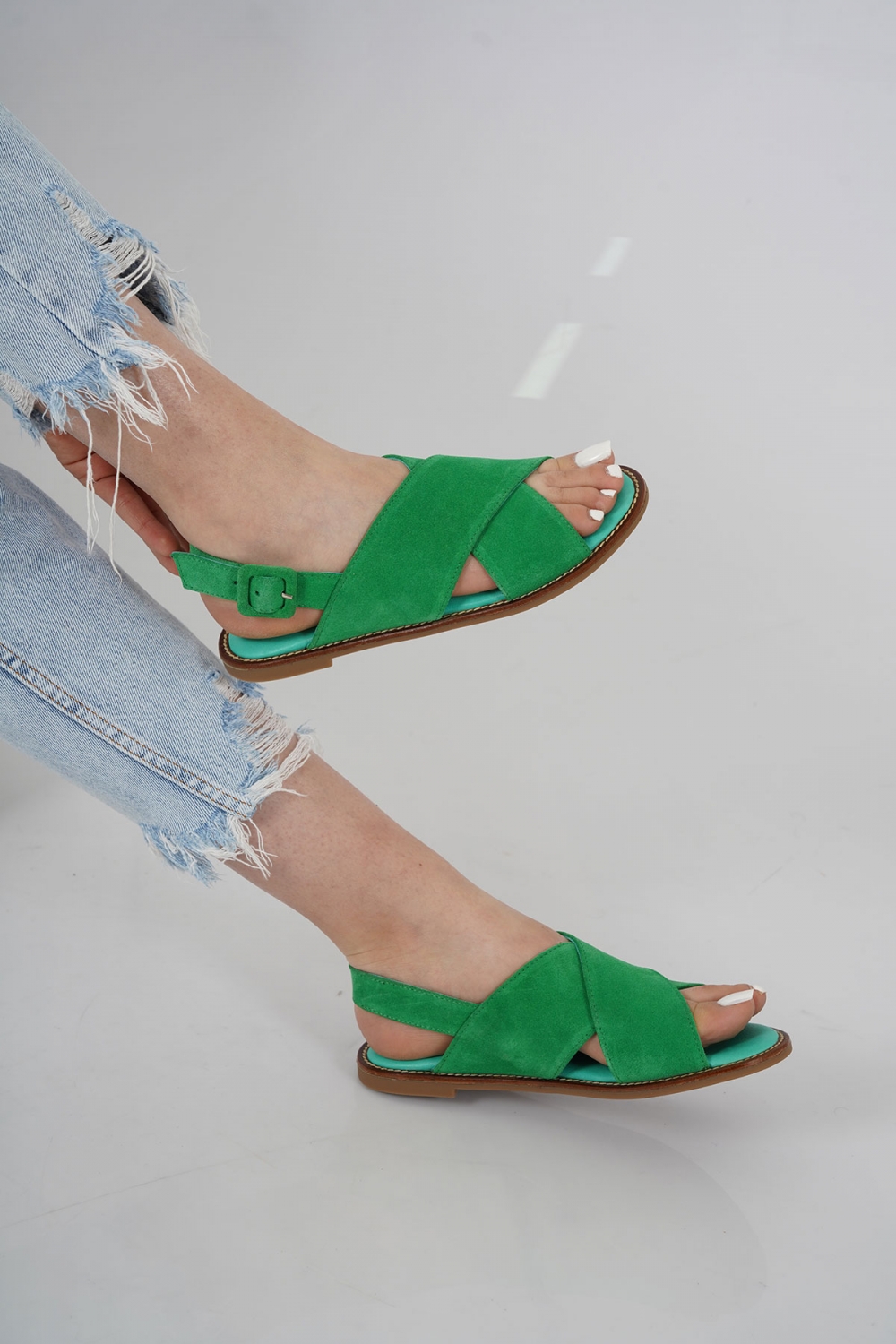 Hakiki Deri Yeşil Süet Kadın Düz Sandalet 231110501